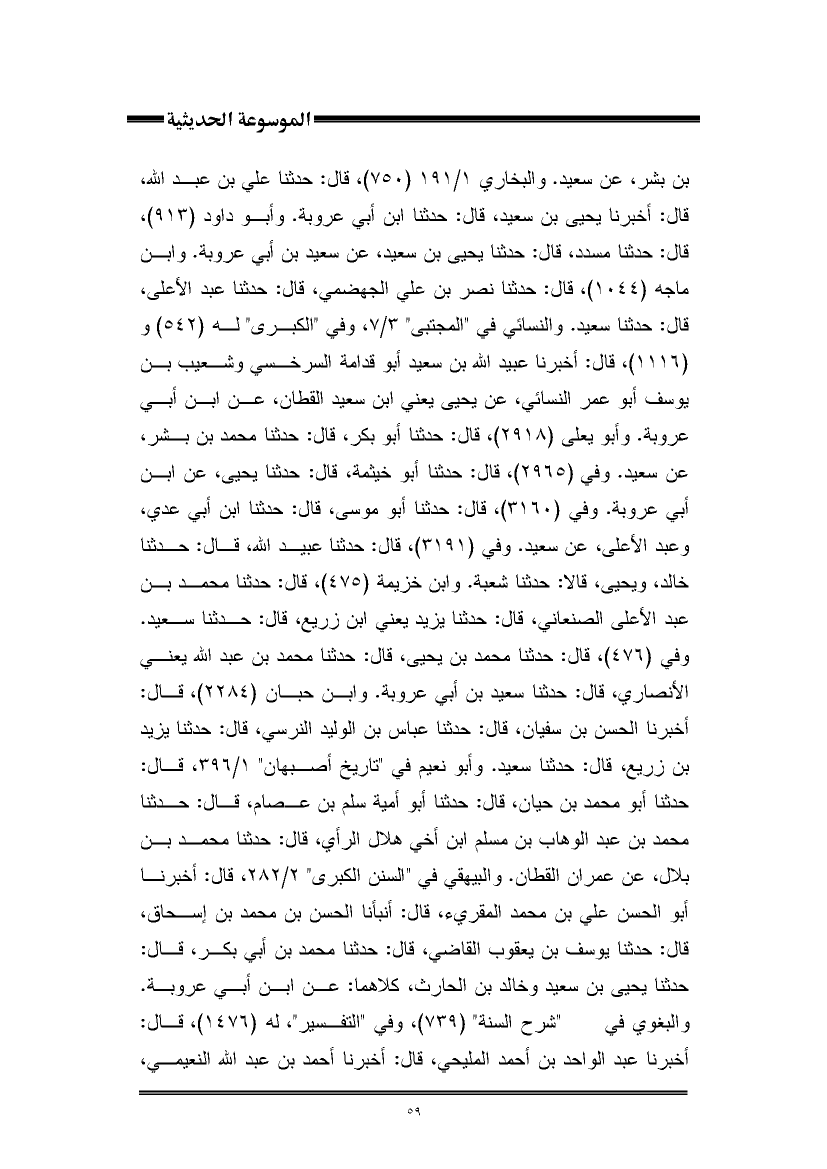 بن بشر، عن سعيد. والبخاري ١/ ١٩١ (٧٥٠)، قال: حدثنا علي بن عبد اللَّه، قال: أخبرنا يحيى بن سعيد، قال: حدثنا ابن أبي عروبة. وأبو داود (٩١٣)، قال: حدثنا مسدد، قال: حدثنا يحيى بن سعيد، عن سعيد بن أبي عروبة. وابن ماجة (١٠٤٤)، قال: حدثنا نصر بن علي الجهضمي، قال: حدثنا عبد الأعلى، قال: حدثنا سعيد. والنسائي في "المجتبى" ٣/ ٧، وفي "الكبرى" له (٥٤٢) و (١١١٦)، قال: أخبرنا عبيد اللَّه بن سعيد أبو قدامة السرخسي وشعيب بن يوسف أبو عمر النسائي، عن يحيى يعني ابن سعيد القطان، عن ابن أبي عروبة. وأبو يعلى (٢٩١٨)، قال: حدثنا أبو بكر، قال: حدثنا محمد بن بشر، عن سعيد. وفي (٢٩٦٥)، قال: حدثنا أبو خيثمة، قال: حدثنا يحيى، عن ابن أبي عروبة. وفي (٣١٦٠)، قال: حدثنا أبو موسى، قال: حدثنا ابن أبي عدي، وعبد الأعلى، عن سعيد. وفي (٣١٩١)، قال: حدثنا عبيد اللَّه، قال: حدثنا خالد، ويحيى، قالا: حدثنا شعبة. وابن خزيمة (٤٧٥)، قال: حدثنا محمد بن عبد الأعلى الصنعاني، قال: حدثنا يزيد يعني ابن زريع، قال: حدثنا سعيد. وفي (٤٧٦)، قال: حدثنا محمد بن يحيى، قال: حدثنا محمد بن عبد اللَّه يعني الأنصاري، قال: حدثنا سعيد بن أبي عروبة. وابن حبان (٢٢٨٤)، قال: أخبرنا الحسن بن سفيان، قال: حدثنا عباس بن الوليد النرسي، قال: حدثنا يزيد بن زريع، قال: حدثنا سعيد. وأبو نعيم في "تاريخ أصبهان" ١/ ٣٩٦، قال: حدثنا أبو محمد بن حيان، قال: حدثنا أبو أمية سلم بن عصام، قال: حدثنا محمد بن عبد الوهاب بن مسلم ابن أخي هلال الرأي، قال: حدثنا محمد بن بلال، عن عمران القطان. والبيهقي في "السنن الكبرى" ٢/ ٢٨٢، قال: أخبرنا أبو الحسن علي بن محمد المقريء، قال: أنبأنا الحسن بن محمد بن إسحاق، قال: حدثنا يوسف بن يعقوب القاضي، قال: حدثنا محمد بن أبي بكر، قال: حدثنا يحيى بن سعيد وخالد بن الحارث، كلاهما: عن ابن أبي عروبة. والبغوي في "شرح السنة" (٧٣٩)، وفي "التفسير"، له (١٤٧٦)، قال: أخبرنا عبد الواحد بن أحمد المليحي، قال: أخبرنا أحمد بن عبد اللَّه النعيمي،
