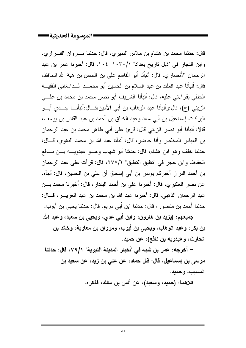 قال: حدثنا محمد بن هشام بن ملاس النميري، قال: حدثنا مروان الفزاري. وابن النجار في "ذيل تاريخ بغداد" ١/ ١٠٣ - ١٠٤، قال: أخبرنا عمر بن عبد الرحمان الأنصاري، قال: أنبأنا أبو القاسم علي بن الحسن بن هبة اللَّه الحافظ، قال: أنبأنا عبد الملك بن عبد السلام بن الحسين أبو محمد الدامغاني الفقيه الحنفي بقراءتي عليه، قال: أنبأنا الشريف أبو نصر محمد بن محمد بن علي الزيني (ح)، قال: وأنبأنا عبد الوهاب بن أبي الأمين، قال: أنبأنا جدي أبو البركات إسماعيل بن أبي سعد وعبد الخالق بن أحمد بن عبد القادر بن يوسف، قالا: أنبأنا أبو نصر الزيني قال: قرئ على أبي طاهر محمد بن عبد الرحمان بن العباس المخلص وأنا حاضر، قال: أنبأنا عبد اللَّه بن محمد البغوي، قال: حدثنا خلف وهو ابن هشام، قال: حدثنا أبو شهاب وهو عبدويه بن نافع الحفاظ. وابن حجر في "تغليق التعليق" ٢/ ٢٧٧، قال: قرأت على عبد الرحمان بن أحمد البزاز أخبركم يونس بن أبي إسحاق أن علي بن الحسين، قال: أنبأه. عن نصر العكبري، قال: أخبرنا علي بن أحمد البندار، قال: أخبرنا محمد بن عبد الرحمان الذهبي، قال: أخبرنا عبد اللَّه بن محمد بن عبد العزيز، قال: حدثنا أحمد بن منصور، قال: حدثنا ابن أبي مريم، قال: حدثنا يحيى بن أيوب.