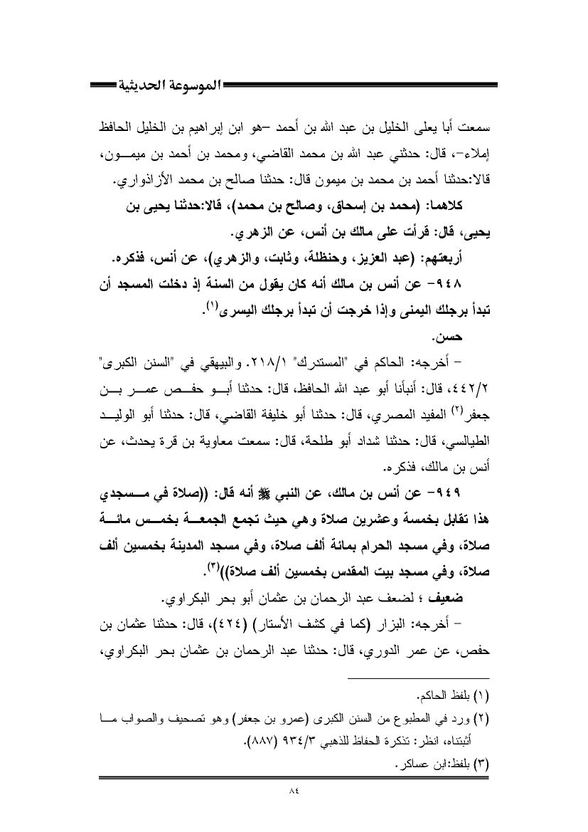 ٩٤٨ - عن أنس بن مالك أنه كان يقول من السنة إذ دخلت المسجد أن تبدأ برجلك اليمنى وإذا خرجت أن تبدأ برجلك اليسرى (¬١).