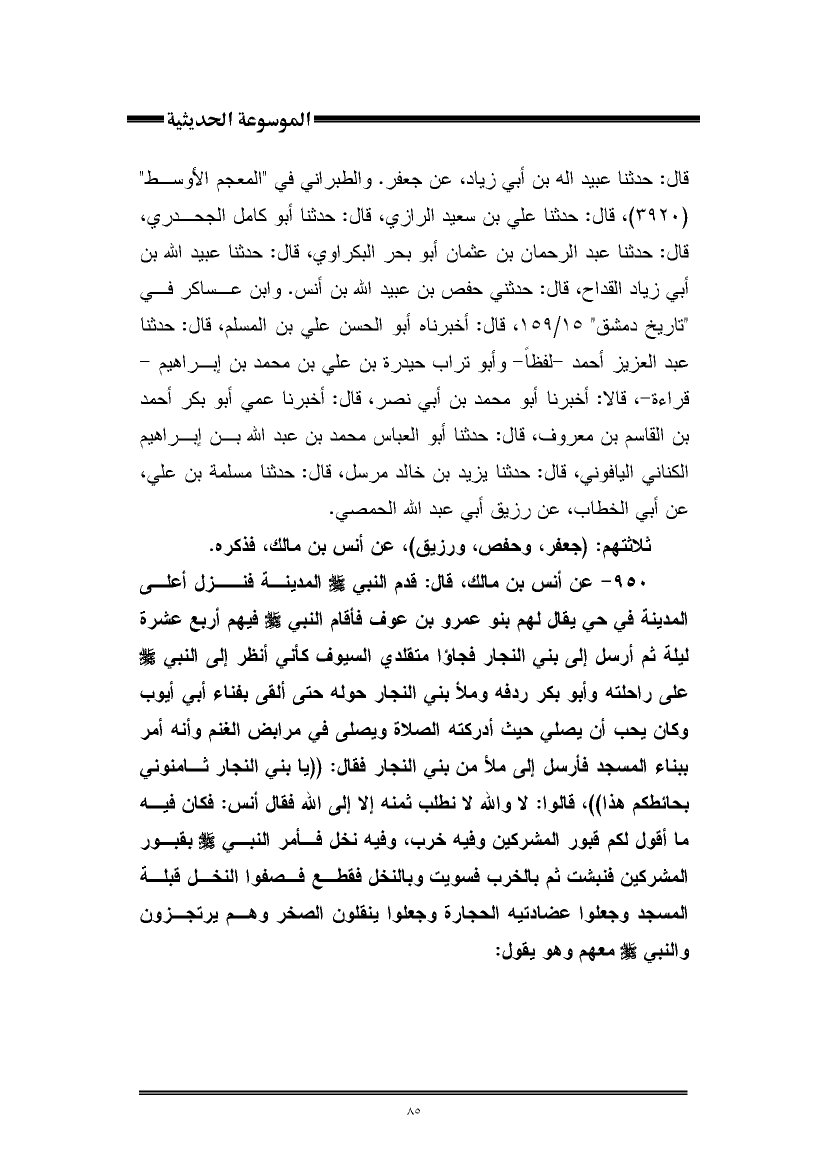 ٩٥٠ - عن أنس بن مالك، قال: قدم النبي -صلى اللَّه عليه وسلم- المدينة فنزل أعلى المدينة في حي يقال لهم بنو عمرو بن عوف فأقام النبي -صلى اللَّه عليه وسلم- فيهم أربع عشرة ليلة ثم أرسل إلى بني النجار فجاؤا متقلدي السيوف كأني أنظر إلى النبي -صلى اللَّه عليه وسلم- على راحلته وأبو بكر ردفه وملأ بني النجار حوله حتى ألفى بفناء أبي أيوب وكان يحب أن يصلي حيث أدركته الصلاة ويصلى في مرابض الغنم وأنه أمر ببناء المسجد فأرسل إلى ملأ من بني النجار فقال: "يا بني النجار ثامنوني بحائطكم هذا"، قالوا: لا واللَّه لا نطلب ثمنه إلا إلى اللَّه فقال أنس: فكان فيه ما أقول لكم قبور المشركين وفيه خرب، وفيه نخل فأمر النبي -صلى اللَّه عليه وسلم- بقبور المشركين فنبشت ثم بالخرب فسويت وبالنخل فقطع فصفوا النخل قبلة المسجد وجعلوا عضادتيه الحجارة وجعلوا ينقلون الصخر وهم يرتجزون والنبي -صلى اللَّه عليه وسلم- معهم وهو يقول: