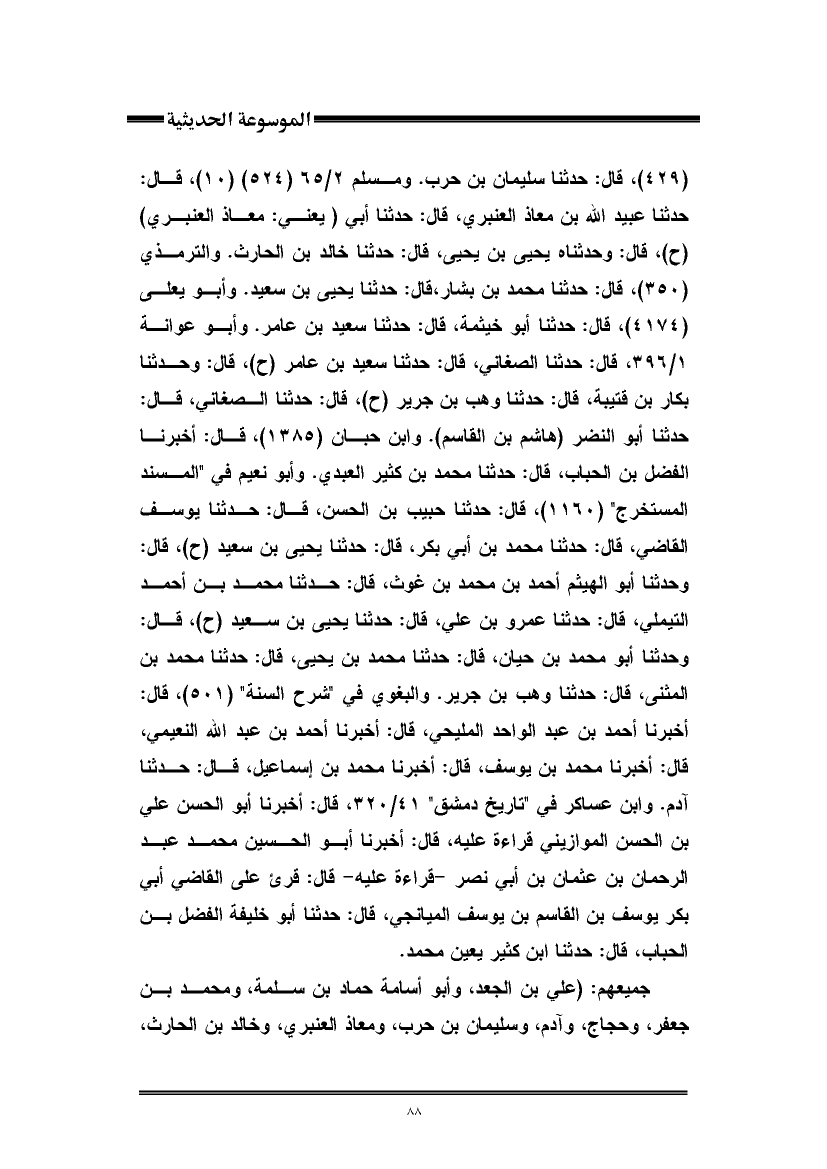 جميعهم: (علي بن الجعد، وأبو أسامة حماد بن سلمة، ومحمد بن جعفر، وحجاج، وآدم، وسليمان بن حرب، ومعاذ العنبري، وخالد بن الحارث،