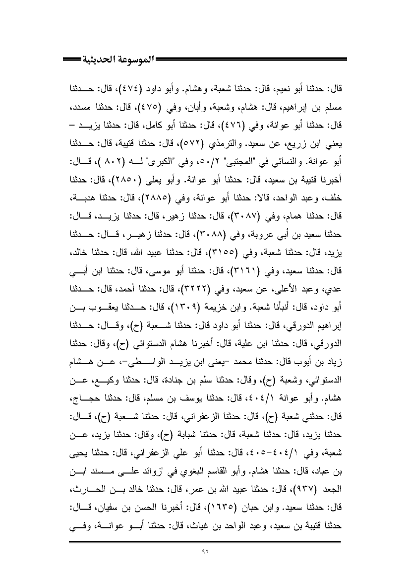 قال: حدثنا أبو نعيم، قال: حدثنا شعبة، وهشام. وأبو داود (٤٧٤)، قال: حدثنا مسلم بن إبراهيم، قال: هشام، وشعبة، وأبان، وفي (٤٧٥)، قال: حدثنا مسدد، قال: حدثنا أبو عوانة، وفي (٤٧٦)، قال: حدثنا أبو كامل، قال: حدثنا يزيد - يعني ابن زريع، عن سعيد. والترمذي (٥٧٢)، قال: حدثنا قتيبة، قال: حدثنا أبو عوانة. والنسائي في "المجتبى" ٢/ ٥٠، وفي "الكبرى" له (٨٠٢)، قال: أخبرنا قتيبة بن سعيد، قال: حدثنا أبو عوانة. وأبو يعلى (٢٨٥٠)، قال: حدثنا خلف، وعبد الواحد، قالا: حدثنا أبو عوانة، وفي (٢٨٨٥)، قال: حدثنا هدبة، قال: حدثنا همام، وفي (٣٠٨٧)، قال: حدثنا زهير، قال: حدثنا يزيد، قال: حدثنا سعيد بن أبي عروبة، وفي (٣٠٨٨)، قال: حدثنا زهير، قال: حدثنا يزيد، قال: حدثنا شعبة، وفي (٣١٥٥)، قال: حدثنا عبيد اللَّه، قال: حدثنا خالد، قال: حدثنا سعيد، وفي (٣١٦١)، قال: حدثنا أبو موسى، قال: حدثنا ابن أبي عدي، وعبد الأعلى، عن سعيد، وفي (٣٢٢٢)، قال: حدثنا أحمد، قال: حدثنا أبو داود، قال: أنبأنا شعبة. وابن خزيمة (١٣٠٩)، قال: حدثنا يعقوب بن إبراهيم الدورقي، قال: حدثنا أبو داود قال: حدثنا شعبة (ح)، وقال: حدثنا الدورقي، قال: حدثنا ابن علية، قال: أخبرنا هشام الدستوائي (ح)، وقال: حدثنا زياد بن أيوب قال: حدثنا محمد -يعني ابن يزيد الواسطي-، عن هشام الدستوائي، وشعبة (ح)، وقال: حدثنا سلم بن جنادة، قال: حدثنا وكيع، عن هشام. وأبو عوانة ١/ ٤٠٤، قال: حدثنا يوسف بن مسلم، قال: حدثنا حجاج، قال: حدثني شعبة (ح)، قال: حدثنا الزعفراني، قال: حدثنا شعبة (ح)، قال: حدثنا يزيد، قال: حدثنا شعبة، قال: حدثنا شبابة (ح)، وقال: حدثنا يزيد، عن شعبة، وفي ١/ ٤٠٤ - ٤٠٥، قال: حدثنا أبو علي الزعفراني، قال: حدثنا يحيى بن عباد، قال: حدثنا هشام. وأبو القاسم البغوي في "زوائد على مسند ابن الجعد" (٩٣٧)، قال: حدثنا عبيد اللَّه بن عمر، قال: حدثنا خالد بن الحارث، قال: حدثنا سعيد. وابن حبان (١٦٣٥)، قال: أخبرنا الحسن بن سفيان، قال: حدثنا قتيبة بن سعيد، وعبد الواحد بن غياث، قال: حدثنا أبو عوانة، وفي