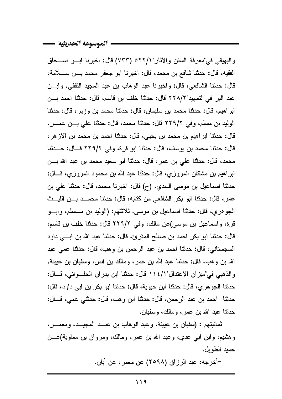 والبيهقي في "معرفة السنن والآثار" ١/ ٥٢٢ (٧٣٣) قال: أخبرنا أبو إسحاق الفقيه، قال: حدثنا شافع بن محمد، قال: أخبرنا أبو جعفر محمد بن سلامة، قال: حدثنا الشافعي، قال: وأخبرنا عبد الوهاب بن عبد المجيد الثقفي. وابن عبد البر في "التمهيد" ٢/ ٢٢٨ قال: حدثنا خلف بن قاسم، قال: حدثنا أحمد بن ابر اهيم، قال: حدثنا محمد بن سليمان، قال: حدثنا محمد بن وزير، قال: حدثنا الوليد بن مسلم، وفي ٢/ ٢٢٩ قال: حدثنا محمد، قال: حدثنا علي بن عمر، قال: حدثنا إبراهيم بن محمد بن يحيى، قال: حدثنا أحمد بن محمد بن الأزهر، قال: حدثنا محمد بن يوسف، قال: حدثنا أبو قرة، وفي ٢/ ٢٢٩ قال: حدثنا محمد، قال: حدثنا علي بن عمر، قال: حدثنا أبو سعيد محمد بن عبد الله بن إبراهيم بن مشان المروزي، قال: حدثنا عبد الله بن محمود المروزي، قال: حدثنا إسماعيل بن موسى السدي، (ح) قال: أخبرنا محمد، قال: حدثنا علي بن عمر، قال: حدثنا أبو بكر الشافعي من كتابه، قال: حدثنا محمد بن الليث الجوهري، قال: حدثنا إسماعيل بن موسى. ثلاثتهم: (الوليد بن مسلم، وأبو قرة، وإسماعيل بن موسى) عن مالك، وفي ٢/ ٢٢٩ قال: حدثنا خلف بن قاسم، قال: حدثنا أبو بكر أحمد بن صالح المقرئ، قال: حدثنا عبد الله بن أبي داود السجستاني، قال: حدثنا أحمد بن عبد الرحمن بن وهب، قال: حدثنا عمي عبد الله بن وهب، قال: حدثنا عبد الله بن عمر، ومالك بن أنس، وسفيان بن عيينة. والذهبي في "ميزان الاعتدال" ١/ ١١٤ قال: حدثنا ابن بدران الحلواني، قال: حدثنا الجوهري، قال: حدثنا ابن حيوية، قال: حدثنا أبو بكر بن أبي داود، قال: حدثنا أحمد بن عبد الرحمن، قال: حدثنا ابن وهب، قال: حدثني عمي، قال: حدثنا عبد الله بن عمر، ومالك، وسفيان.