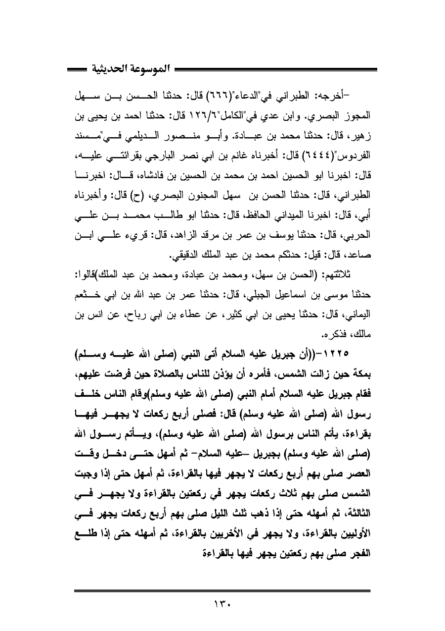 ١٢٢٥ - "أن جبريل عليه السلام أتى النبي (صلى الله عليه وسلم) بمكة حين زالت الشمس، فأمره أن يؤذن للناس بالصلاة حين فرضت عليهم، فقام جبريل عليه السلام أمام النبي (صلى الله عليه وسلم) وقام الناس خلف رسول الله (صلى الله عليه وسلم) قال: فصلى أربع ركعات لا يجهر فيها بقراءة، يأتم الناس برسول الله (صلى الله عليه وسلم)، ويأتم رسول الله (صلى الله عليه وسلم) بجبريل -عليه السلام- ثم أمهل حتى دخل وقت العصر صلى بهم أربع ركعات لا يجهر فيها بالقراءة، ثم أمهل حتى إذا وجبت الشمس صلى بهم ثلاث ركعات يجهر في ركعتين بالقراءة ولا يجهر في الثالثة، ثم أمهله حتى إذا ذهب ثلث الليل صلى بهم أربع ركعات يجهر في الأوليين بالقراءة، ولا يجهر في الأخريين بالقراءة، ثم أمهله حتى إذا طلع الفجر صلى بهم ركعتين يجهر فيها بالقراءة