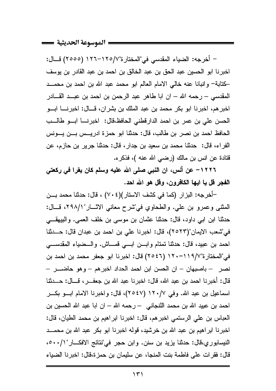 ١٢٢٦ - عن أنس، أن النبي صلى الله عليه وسلم كان يقرأ في ركعتي الفجر قل يا أيها الكافرون، وقل هو الله احد.