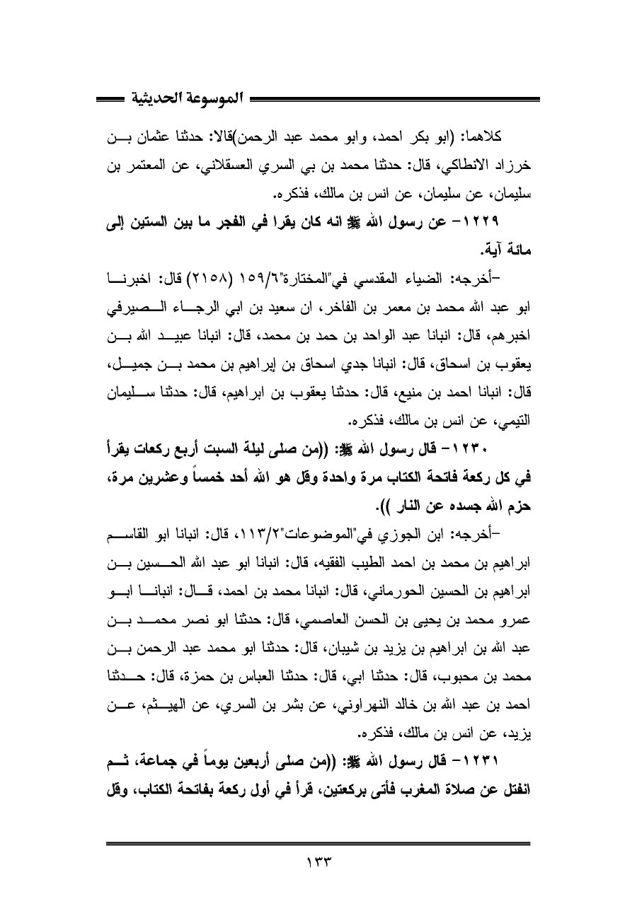 ١٢٣٠ - قال رسول الله.: - صلى الله عليه وسلم - "من صلى ليلة السبت أربع ركعات يقرأ في كل ركعة فاتحة الكتاب مرة واحدة وقل هو الله أحد خمسًا وعشرين مرة، حزم الله جسده عن النار".