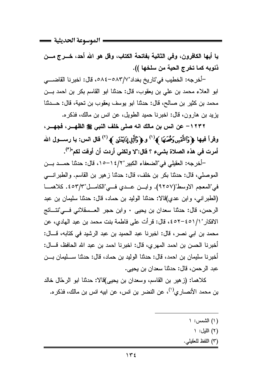 ١٢٣٢ - عن أنس بن مالك انه صلى خلف النبي.- صلى الله عليه وسلم - الظهر، فجهر، وقرأ فيها {وَالشَّمْسِ وَضُحَاهَا} {وَاللَّيْلِ إِذَا يَغْشَاهَا} قال أنس: يا رسول الله أمرت في هذه الصلاة بشيء؟ قال: "لا ولكني أردت أن أوقت لكم" (¬٣).