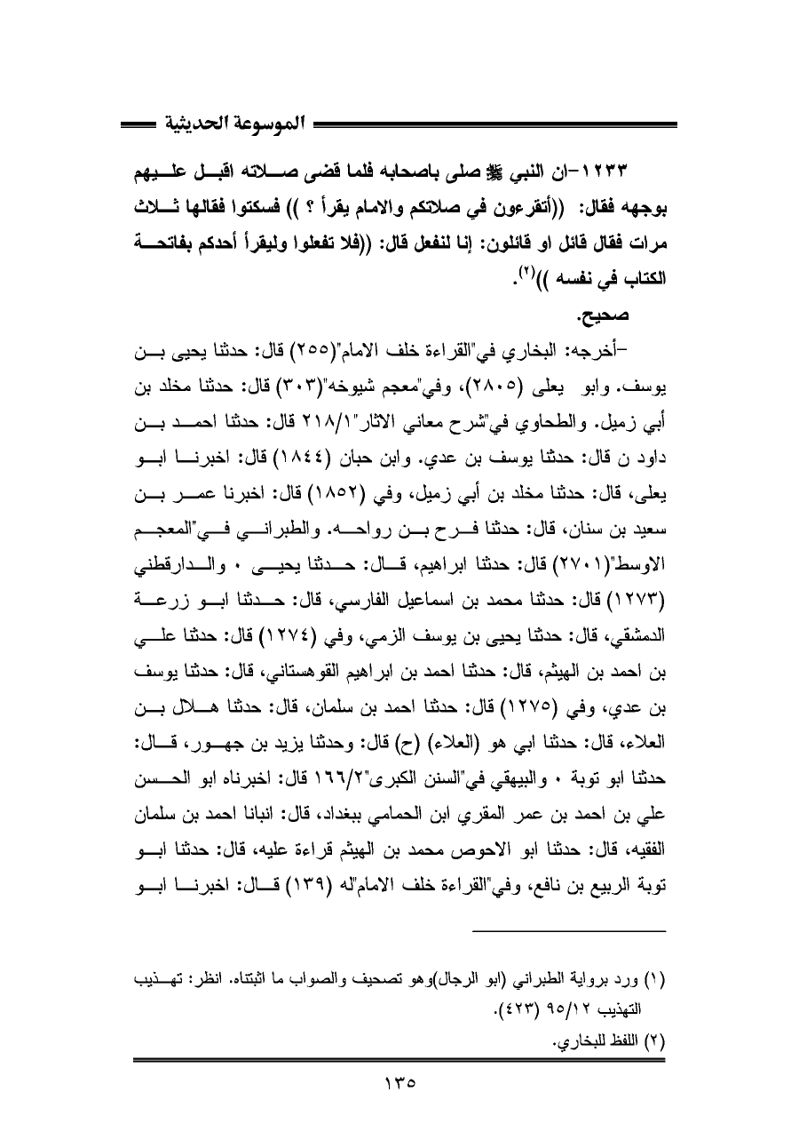 ١٢٣٣ - أن النبي - صلى الله عليه وسلم -. صلى بأصحابه فلما قضى صلاته أقبل عليهم بوجهه فقال: "أتقرءون في صلاتكم والإمام يقرأ؟ " فسكتوا فقالها ثلاث مرات فقال قائل أو قائلون: إنا لنفعل قال: "فلا تفعلوا وليقرأ أحدكم بفاتحة الكتاب في نفسه" (¬١).