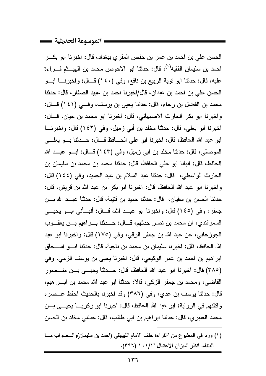الحسن علي بن أحمد بن عمر بن حفص المقري ببغداد، قال: أخبرنا أبو بكر أحمد بن سليمان الفقيه (¬١)، قال: حدثنا أبو الأحوص محمد بن الهيثم قراءة عليه، قال: حدثنا أبو توبة الربيع بن نافع، وفي (١٤٠) قال: وأخبرنا أبو الحسن علي بن أحمد بن عبدان، قال أخبرنا أحمد بن عبيد الصفار، قال: حدثنا محمد بن الفضل بن رجاء، قال: حدثنا يحيى بن يوسف، وفي (١٤١) قال: وأخبرنا أبو بكر الحارث الأصبهاني، قال: أخبرنا أبو محمد بن حيان، قال: أخبرنا أبو يعلى، قال: حدثنا مخلد بن أبي زميل، وفي (١٤٢) قال: وأخبرنا أبو عبد الله الحافظ، قال: أخبرنا أبو علي الحافظ قال: حدثنا بو يعلى الموصلي، قال: حدثنا مخلد بن أبي زميل، وفي (١٤٣) قال: أبو عبد الله الحافظ، قال: أنبأنا أبو علي الحافظ، قال: حدثنا محمد بن محمد بن سليمان بن الحارث الواسطي، قال: حدثنا عبد السلام بن عبد الحميد، وفي (١٤٤) قال: وأخبرنا أبو عبد الله الحافظ، قال: أخبرنا أبو بكر بن عبد الله بن قريش، قال: حدثنا الحسن بن سفيان، قال: حدثنا حميد بن قتيبة، قال: حدثنا عبد الله بن جعفر، وفي (١٤٥) قال: وأخبرنا أبو عبد الله، قال: أنبأني أبو يحيى السمرقندي، ان محمد بن نصر حدثهم، قال: حدثنا براهيم بن يعقوب الجوزجاني، عن عبد الله بن جعفر الرقي، وفي (١٧٥) قال: وأخبرنا أبو عبد الله الحافظ، قال: أخبرنا سليمان بن محمد بن ناجية، قال: حدثنا أبو إسحاق إبراهيم بن أحمد بن عمر الوكيعي، قال: أخبرنا يحيى بن يوسف الزمي، وفي (٣٨٥) قال: أخبرنا أبو عبد الله الحافظ، قال: حدثنا يحيى بن منصور القاضي، ومحمد بن جعفر الزكي، قالا: حدثنا أبو عبد الله محمد بن إبراهيم، قال: حدثنا يوسف بن عدي، وفي (٣٨٦) وقد أخبرنا بالحديث احفظ عصره وأتقنهم في الرواية: أبو عبد الله الحافظ، قال: أخبرنا أبو زكريا يحيى بن محمد العنبري، قال: حدثنا إبراهيم بن أبي طالب، قال: حدثني مخلد بن الحسن