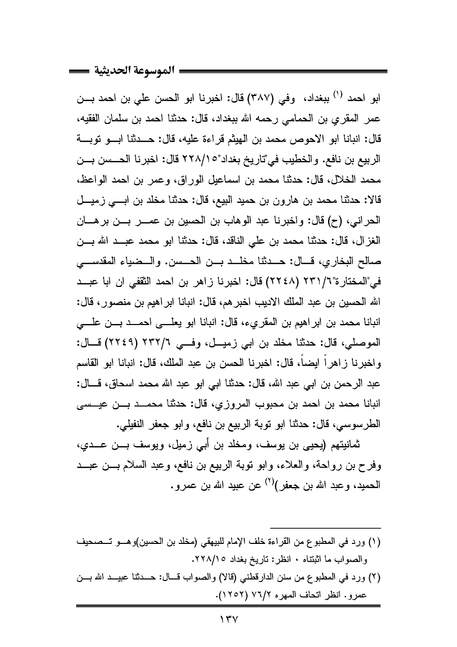 أبو أحمد (¬١) ببغداد، وفي (٣٨٧) قال: أخبرنا أبو الحسن علي بن أحمد بن عمر المقري بن الحمامي رحمه الله ببغداد، قال: حدثنا أحمد بن سلمان الفقيه، قال: أنبأنا أبو الأحوص محمد بن الهيثم قراءة عليه، قال: حدثنا أبو توبة الربيع بن نافع. والخطيب في "تاريخ بغداد" ١٥/ ٢٢٨ قال: أخبرنا الحسن بن محمد الخلال، قال: حدثنا محمد بن إسماعيل الوراق، وعمر بن أحمد الواعظ، قالا: حدثنا محمد بن هارون بن حميد البيع، قال: حدثنا مخلد بن أبي زميل الحراني، (ح) قال: وأخبرنا عبد الوهاب بن الحسين بن عمر بن برهان الغزال، قال: حدثنا محمد بن علي الناقد، قال: حدثنا أبو محمد عبد الله بن صالح البخاري، قال: حدثنا مخلد بن الحسن. والضياء المقدسي في "المختارة" ٦/ ٢٣١ (٢٢٤٨) قال: أخبرنا زاهر بن أحمد الثقفي ان أبا عبد الله الحسين بن عبد الملك الأديب أخبرهم، قال: أنبأنا إبراهيم بن منصور، قال: أنبأنا محمد بن إبراهيم بن المقرئ، قال: أنبأنا أبو يعلى أحمد بن علي الموصلي، قال: حدثنا مخلد بن أبي زميل، وفي ٦/ ٢٣٢ (٢٢٤٩) قال: وأخبرنا زاهرًا أيضًا، قال: أخبرنا الحسن بن عبد الملك، قال: أنبأنا أبو القاسم عبد الرحمن بن أبي عبد الله، قال: حدثنا أبي أبو عبد الله محمد إسحاق، قال: أنبأنا محمد بن أحمد بن محبوب المروزي، قال: حدثنا محمد بن عيسى الطرسوسي، قال: حدثنا أبو توبة الربيع بن نافع، وأبو جعفر النفيلي.