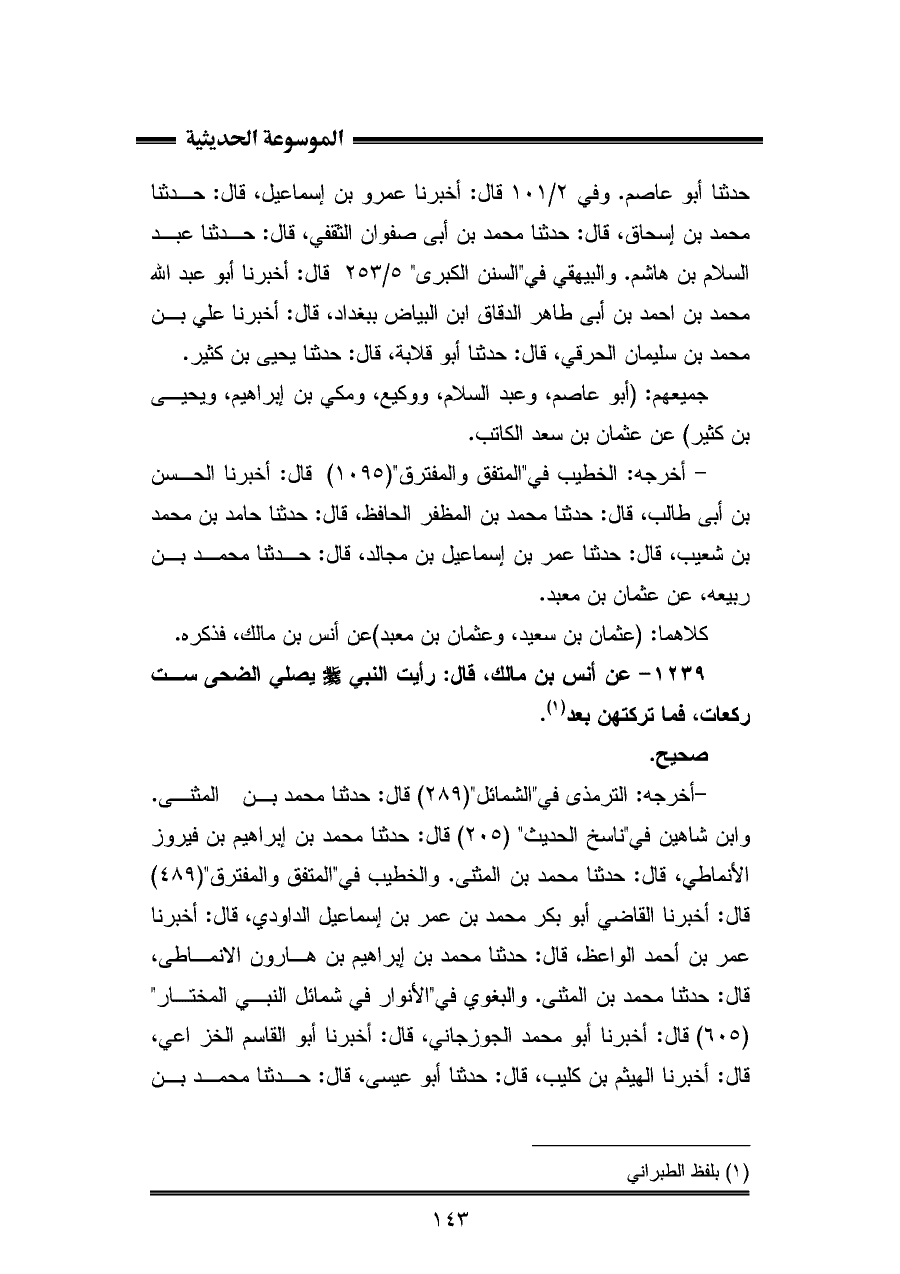حدثنا أبو عاصم. وفي ٢/ ١٠١ قال: أخبرنا عمرو بن إسماعيل، قال: حدثنا محمد بن إسحاق، قال: حدثنا محمد بن أبى صفوان الثقفي، قال: حدثنا عبد السلام بن هاشم. والبيهقي في "السنن الكبرى" ٥/ ٢٥٣ قال: أخبرنا أبو عبد الله محمد بن أحمد بن أبى طاهر الدقاق ابن البياض ببغداد، قال: أخبرنا علي بن محمد بن سليمان الحرقي، قال: حدثنا أبو قلابة، قال: حدثنا يحيى بن كثير.