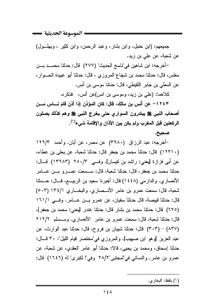 ١٢٤٣ - عن أنس بن مالك، قال: كان المؤذن إذا أذن قام ناس من أصحاب النبي. يبتدرون السواري حتى يخرج النبي. وهم كذلك يصلون الركعتين قبل المغرب ولم يكن بين الأذان والإقامة شيء (¬١).