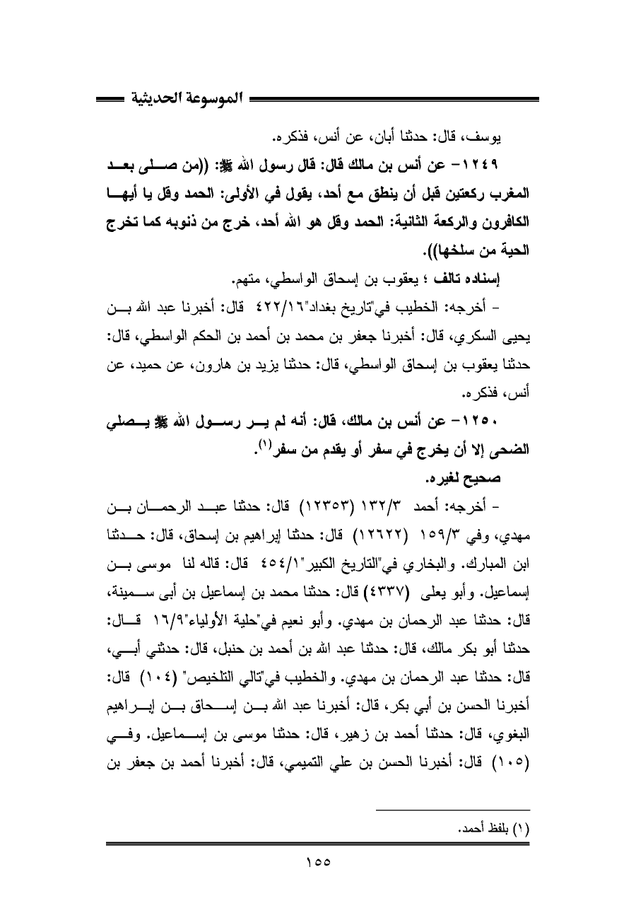 ١٢٤٩ - عن أنس بن مالك قال: قال رسول اللّه - صلى الله عليه وسلم -: "من صلى بعد المغرب ركعتين قبل أن ينطق مع أحد، يقول في الأولى: الحمد وقل يا أيها الكافرون والركعة الثانية: الحمد وقل هو اللّه أحد، خرج من ذنوبه كما تخرج الحية من سلخها".