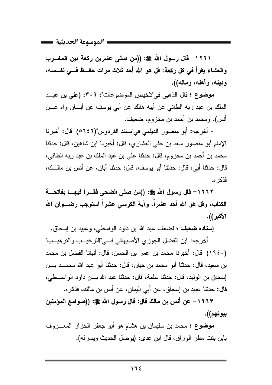 ١٢٦١ - قال رسول اللّه - صلى الله عليه وسلم -: "من صلى عشرين ركعة بين المغرب والعشاء يقرأ في كل ركعة: قل هو اللّه أحد ثلاث مرات حفظ في نفسه، ودينه، وأهله، وماله".