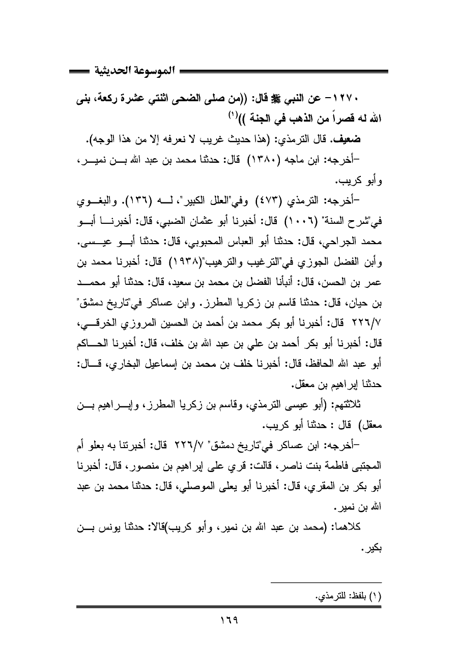 ١٢٧٠ - عن النَّبِيّ - صلى الله عليه وسلم - قال: "من صلى الضحى اثنتي عشرة ركعة، بنى اللّه له قصرًا من الذهب في الجنة" (¬١)