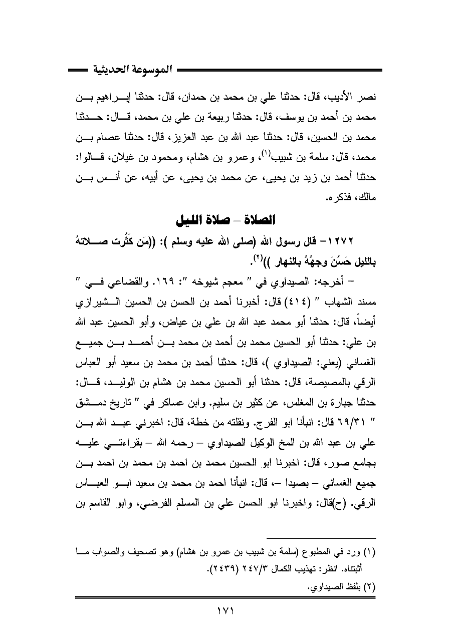 ١٢٧٢ - قال رسول اللّه (صلى اللّه عليه وسلم): "مَن كَثُرت صلاتهُ بالليل حَسُنَ وجهُهُ بالنهار" (¬٢).