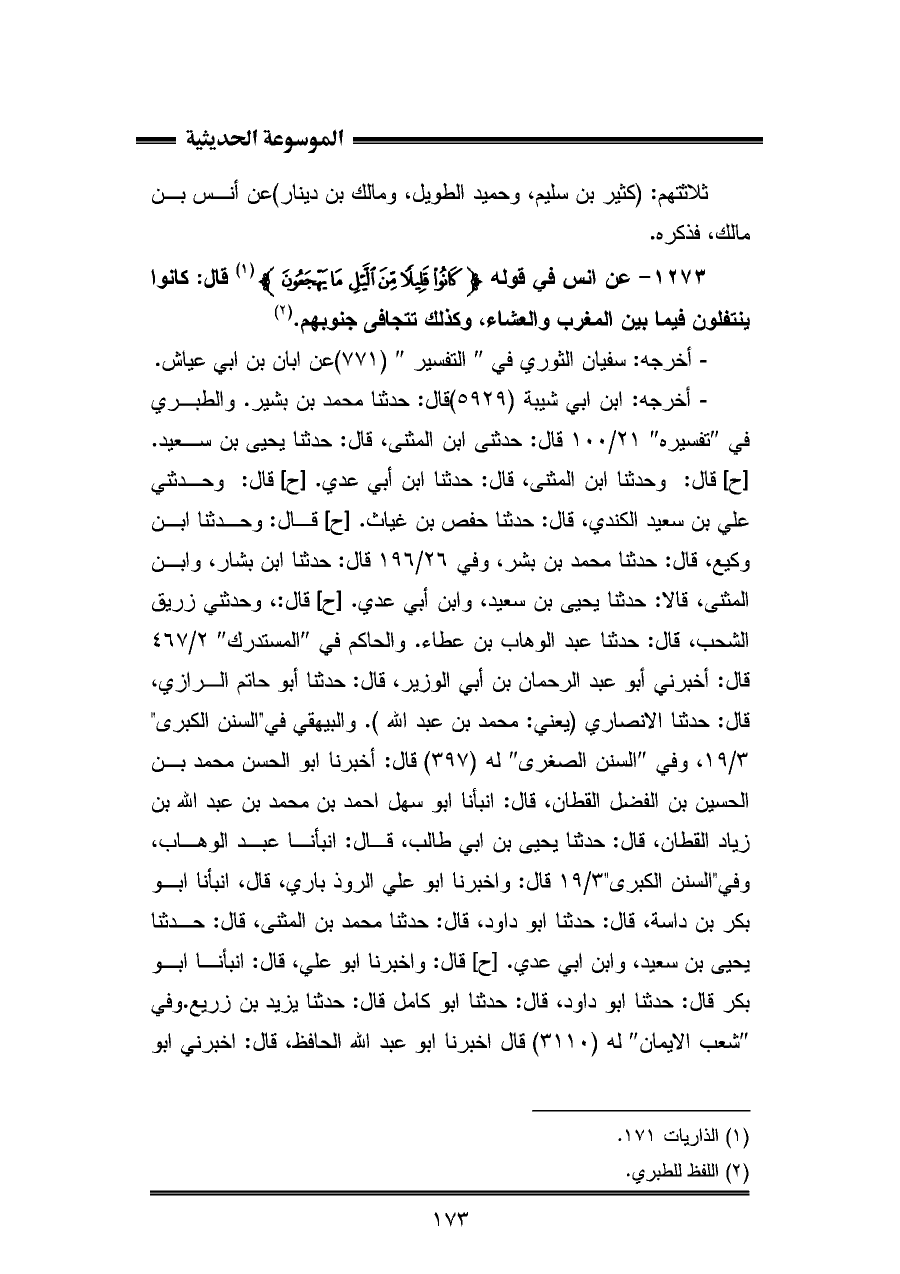١٢٧٣ - عن أنس في قوله {كَانُوا قَلِيلًا مِنَ اللَّيْلِ مَا يَهْجَعُونَ} قال: كانوا ينتفلون فيما بين المغرب والعشاء، وكذلك تتجافى جنوبهم. (¬٢)