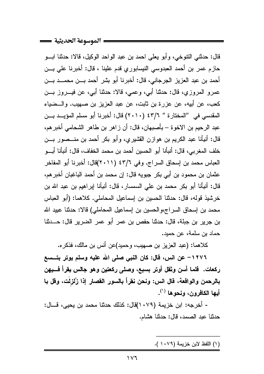 ١٢٧٦ - عن أنس، قال: كان النَّبِيّ صلى اللّه عليه وسلم يوتر بتسع ركعات. فلما أسن وثقل أوتر بسبع، وصلى ركعتين وهو جالس يقرأ فيهن بالرحمن والواقعة، قال أنس: ونحن نقرأ بالسور القصار إذا زُلزِلَت، وقل يا أيها الكافرون، ونحوها (¬١).