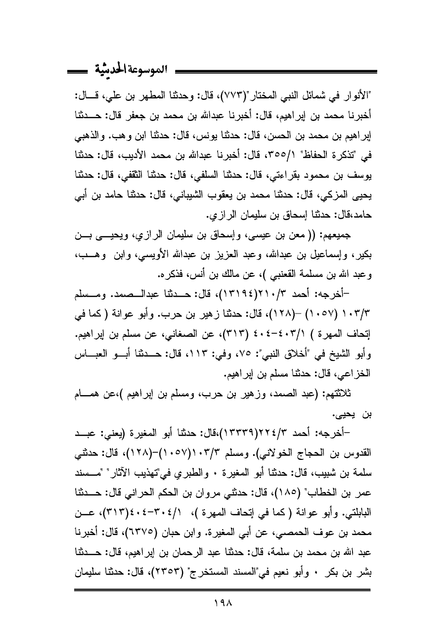 "الأنوار في شمائل النَّبِيّ المختار" (٧٧٣)، قال: وحدثنا المطهر بن علي، قال: أخبرنا محمد بن إبراهيم، قال: أخبرنا عبد اللّه بن محمد بن جعفر قال: حَدَّثَنَا إبراهيم بن محمد بن الحسن، قال: حَدَّثَنَا يونس، قال: حَدَّثَنَا ابن وهب. والذهبي في "تذكرة الحفاظ" ١/ ٣٥٥، قال: أخبرنا عبد اللّه بن محمد الأديب، قال: حَدَّثَنَا يوسف بن محمود بقراءتي، قال: حَدَّثَنَا السلفي، قال: حَدَّثَنَا الثقفي، قال: حَدَّثَنَا يحيى المزكي، قال: حَدَّثَنَا محمد بن يعقوب الشيباني، قال: حَدَّثَنَا حامد بن أبي حامد، قال: حَدَّثَنَا إسحاق بن سليمان الرازي.