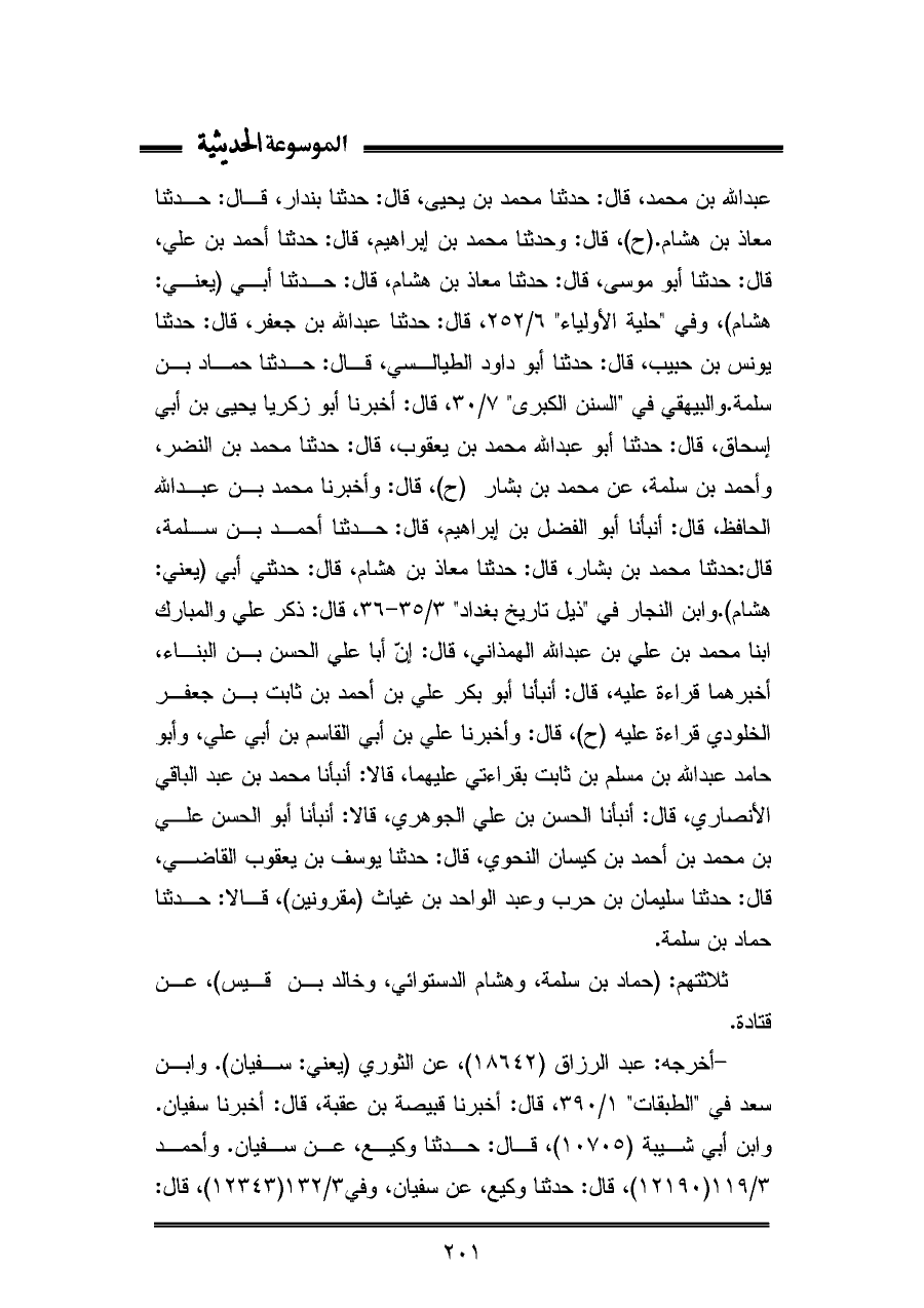 عبد اللّه بن محمد، قال: حَدَّثَنَا محمد بن يحيى، قال: حَدَّثَنَا بندار، قال: حَدَّثَنَا معاذ بن هشام. (ح)، قال: وحدثنا محمد بن إبراهيم، قال: حَدَّثَنَا أحمد بن علي، قال: حَدَّثَنَا أبو موسى، قال: حَدَّثَنَا معاذ بن هشام، قال: حَدَّثَنَا أبي (يعني: هشام)، وفي "حلية الأولياء" ٦/ ٢٥٢، قال: حَدَّثَنَا عبد اللّه بن جعفر، قال: حَدَّثَنَا يونس بن حبيب، قال: حَدَّثَنَا أبو داود الطيالسي، قال: حَدَّثَنَا حماد بن سلمة. والبيهقي في "السنن الكبرى" ٧/ ٣٠، قال: أخبرنا أبو زكريا يحيى بن أبي إسحاق، قال: حَدَّثَنَا أبو عبد اللّه محمد بن يعقوب، قال: حَدَّثَنَا محمد بن النضر، وأحمد بن سلمة، عن محمد بن بشار (ح)، قال: وأخبرنا محمد بن عبد اللّه الحافظ، قال: أنبأنا أبو الفضل بن إبراهيم، قال: حَدَّثَنَا أحمد بن سلمة، قال: حَدَّثَنَا محمد بن بشار، قال: حَدَّثَنَا معاذ بن هشام، قال: حدثني أبي (يعني: هشام). وابن النجار في "ذيل تاريخ بغداد" ٣/ ٣٥ - ٣٦، قال: ذكر علي والمبارك ابنا محمد بن علي بن عبد اللّه الهمذاني، قال: أنّ أبا علي الحسن بن البناء، أخبرهما قراءة عليه، قال: أنبأنا أبو بكر علي بن أحمد بن ثابت بن جعفر الخلودي قراءة عليه (ح)، قال: وأخبرنا علي بن أبي القاسم بن أبي علي، وأبو حامد عبد اللّه بن مسلم بن ثابت بقراءتي عليهما، قالا: أنبأنا محمد بن عبد الباقي الأنصاري، قال: أنبأنا الحسن بن علي الجوهري، قالا: أنبأنا أبو الحسن علي بن محمد بن أحمد بن كيسان النحوي، قال: حَدَّثَنَا يوسف بن يعقوب القاضي، قال: حَدَّثَنَا سليمان بن حرب وعبد الواحد بن غياث (مقرونين)، قالا: حَدَّثَنَا حماد بن سلمة.