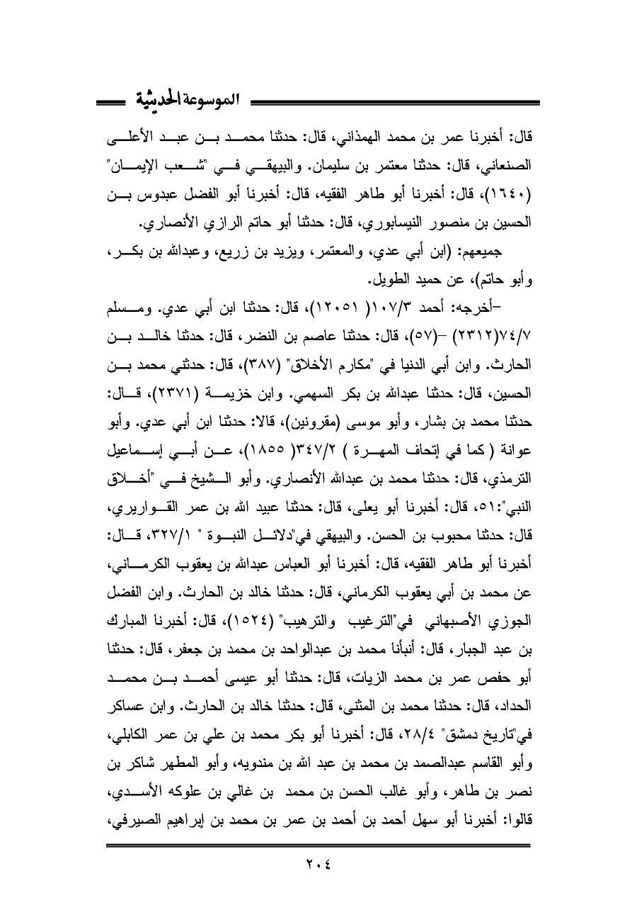 قال: أخبرنا عمر بن محمد الهمذاني، قال: حَدَّثَنَا محمد بن عبد الأعلى الصنعاني، قال: حَدَّثَنَا معتمر بن سليمان. والبيهقي في "شعب الإيمان" (١٦٤٠)، قال: أخبرنا أبو طاهر الفقيه، قال: أخبرنا أبو الفضل عبدوس بن الحسين بن منصور النيسابوري، قال: حَدَّثَنَا أبو حاتم الرازي الأنصاري.