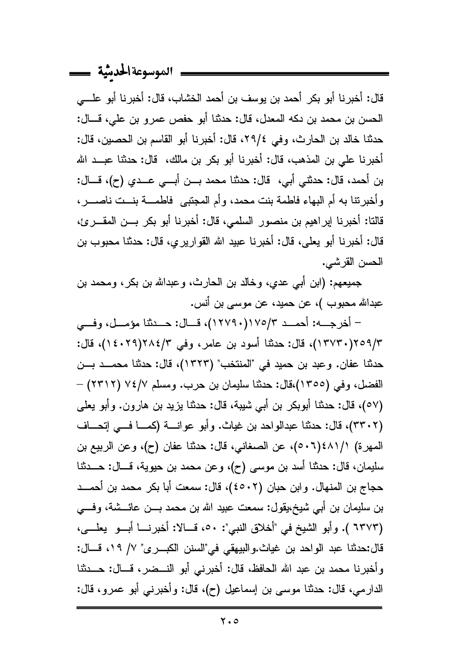 قال: أخبرنا أبو بر أحمد بن يوسف بن أحمد الخشاب، قال: أخبرنا أبو علي الحسن بن محمد بن دكه المعدل، قال: حَدَّثَنَا أبو حفص عمرو بن علي، قال: حَدَّثَنَا خالد بن الحارث، وفي ٤/ ٢٩، قال: أخبرنا أبو القاسم بن الحصين، قال: أخبرنا علي بن المذهب، قال: أخبرنا أبو بكر بن مالك، قال: حَدَّثَنَا عبد اللّه بن أحمد، قال: حدثني أبي، قال: حَدَّثَنَا محمد بن أبي عدي (ح)، قال: وأخبرتنا به أم البهاء فاطمة بنت محمد، وأم المجتبى فاطمة بنت ناصر، قالتا: أخبرنا إبراهيم بن منصور السلمي، قال: أخبرنا أبو بكر بن المقرئ، قال: أخبرنا أبو يعلى، قال: أخبرنا عبيد اللّه القواريري، قال: حَدَّثَنَا محبوب بن الحسن القرشي.
