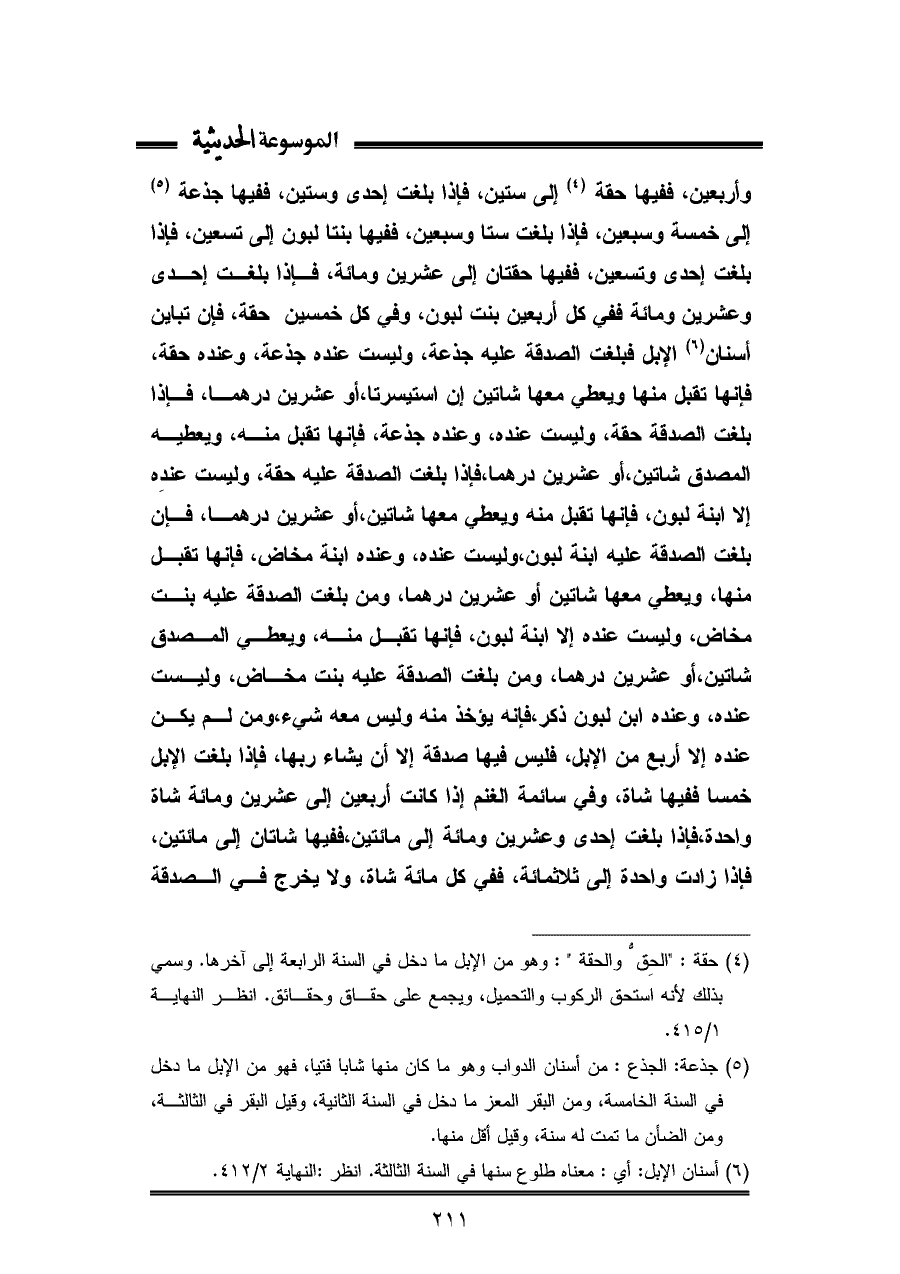 (¬٦) أسنان الإبل: أي: معناه طلوع سنها في السنة الثالثة. انظر: النهاية ٢/ ٤١٢.