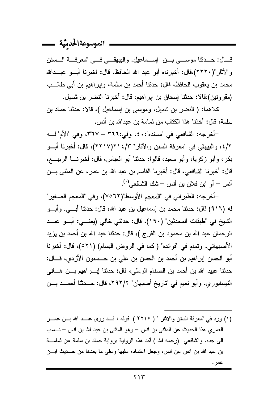 (¬١) ورد في "معرفة السنن والآثار" (٢٢١٧) قوله: قد روى عبد اللّه بن عمر العمري هذا الحديث عن المثنى بن أنس - وهو المثنى بن عبد اللّه بن أنس نسب الـ ... ــ جده. والشافعي (رحمه اللّه) أكد هذه الرواية برواية حماد بن سلمة عن ثمامة بن عبد اللّه بن أنس عن أنس، وجعل اعتماده عليها وعلى ما بعدها من حديث ابن عمر.