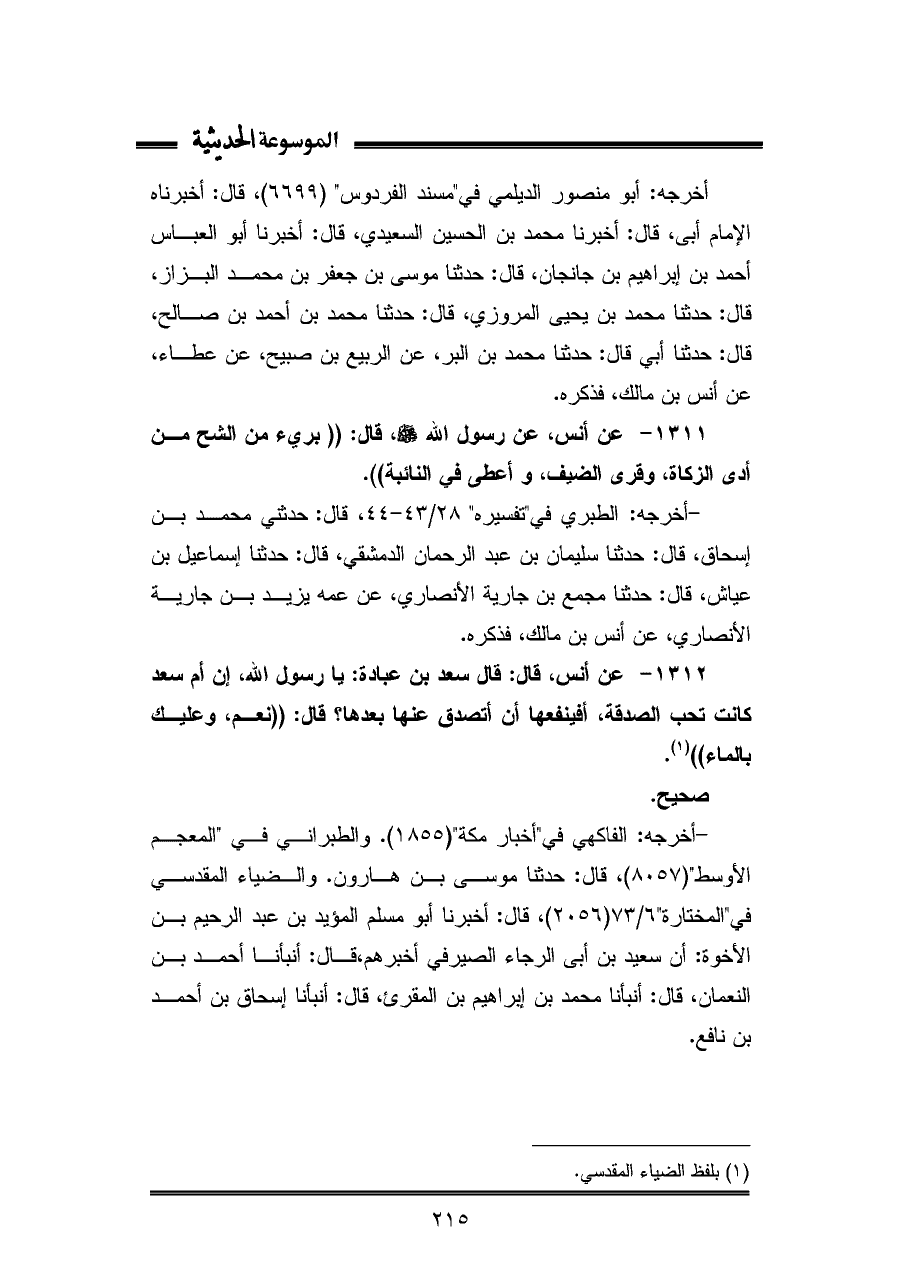 ١٣١٢ - عن أنس، قال: قال سعد بن عبادة: يا رسول اللّه، إن أم سعد كانت تحب الصدقة، أفينفعها أن أتصدق عنها بعدها؟ قال: "نعم، وعليك بالماء" (¬١).