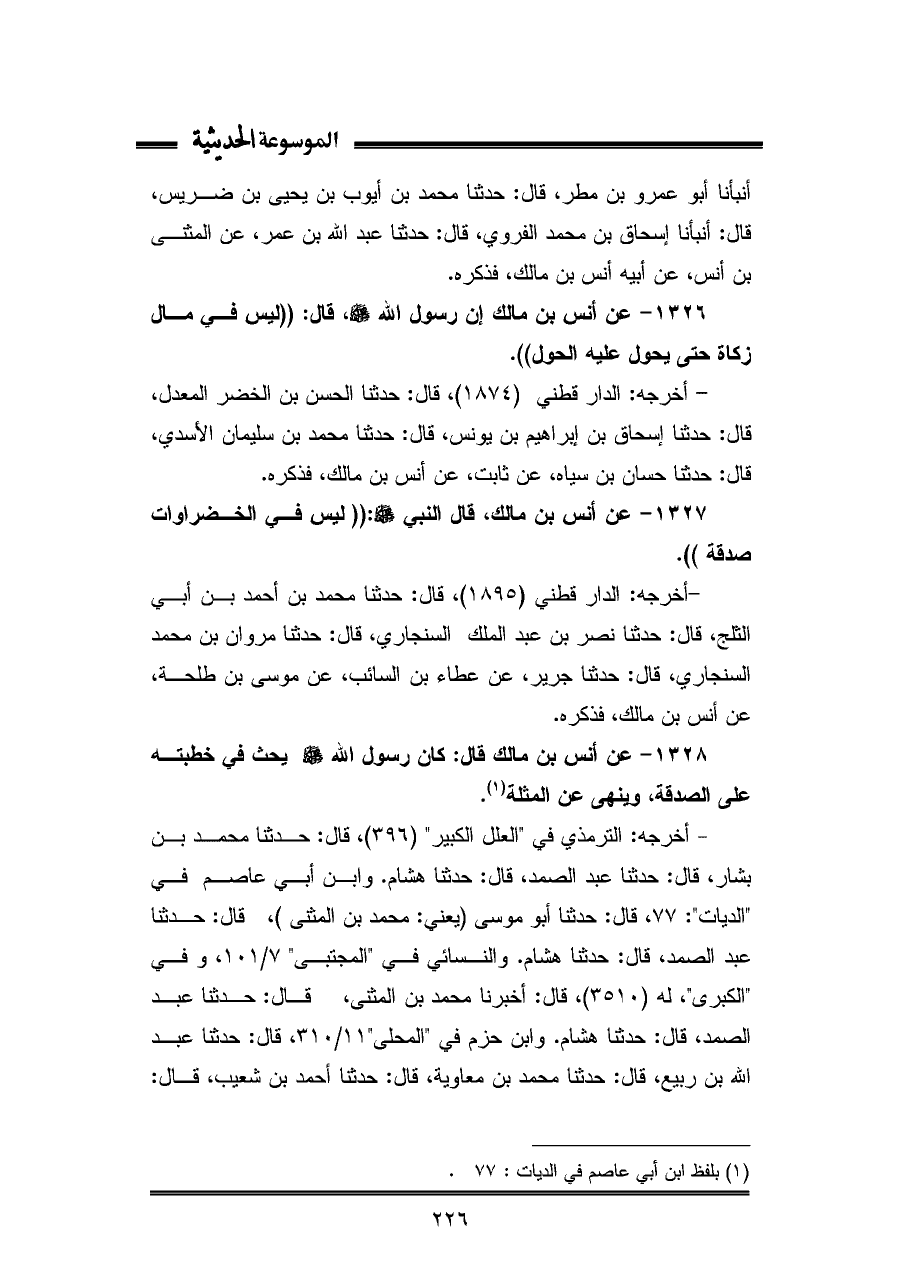١٣٢٦ - عن أنس بن مالك إن رسول اللّه - صلى الله عليه وسلم -، قال: "ليس في مال زكاة حتى يحول عليه الحول".