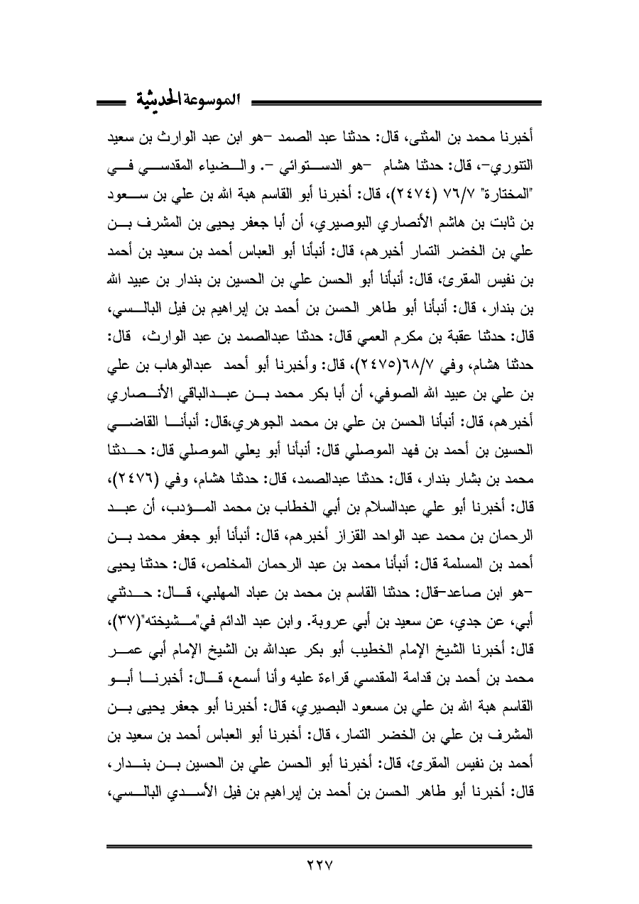 أخبرنا محمد بن المثنى، قال: حَدَّثَنَا عبد الصمد - هو ابن عبد الوارث بن سعيد التنوري -، قال: حَدَّثَنَا هشام - هو الدستوائي -. والضياء المقدسي في "المختارة" ٧/ ٧٦ (٢٤٧٤)، قال: أخبرنا أبو القاسم هبة اللّه بن علي بن سعود بن ثابت بن هاشم الأنصاري البوصيري، أن أبا جعفر يحيى بن المشرف بن علي بن الخضر التمار أخبرهم، قال: أنبأنا أبو العباس أحمد بن سعيد بن أحمد بن نفيس المقرئ، قال: أنبأنا أبو الحسن علي بن الحسين بن بندار بن عبيد اللّه بن بندار، قال: أنبأنا أبو طاهر الحسن بن أحمد بن إبراهيم بن فيل البالسي، قال: حَدَّثَنَا عقبة بن مكرم العمي قال: حَدَّثَنَا عبد الصمد بن عبد الوارث، قال: حَدَّثَنَا هشام، وفي ٧/ ٦٨ (٢٤٧٥)، قال: وأخبرنا أبو أحمد عبد الوهاب بن علي بن علي بن عبيد اللّه الصوفي، أن أبا بكر محمد بن عبد الباقي الأنصاري أخبرهم، قال: أنبأنا الحسن بن علي بن محمد الجوهري، قال: أنبأنا القاضي الحسين بن أحمد بن فهد الموصلي قال: أنبأنا أبو يعلي الموصلي قال: حَدَّثَنَا محمد بن بشار بندار، قال: حَدَّثَنَا عبد الصمد، قال: حَدَّثَنَا هشام، وفي (٢٤٧٦)، قال: أخبرنا أبو علي عبد السلام بن أبي الخطاب بن محمد المؤدب، أن عبد الرحمان بن محمد عبد الواحد القزاز أخبرهم، قال: أنبأنا أبو جعفر محمد بن أحمد بن المسلمة قال: أنبأنا محمد بن عبد الرحمان المخلص، قال: حَدَّثَنَا يحيى - هو ابن صاعد - قال: حَدَّثَنَا القاسم بن محمد بن عباد المهلبي، قال: حدثني أبي، عن جدي، عن سعيد بن أبي عروبة. وابن عبد الدائم في "مشيخته" (٣٧)، قال: أخبرنا الشيخ الإمام الخطيب أبو بكر عبد اللّه بن الشيخ الإمام أبي عمر محمد بن أحمد بن قدامة المقدسي قراءة عليه وأنا أسمع، قال: أخبرنا أبو القاسم هبة اللّه بن علي بن مسعود البصيري، قال: أخبرنا أبو جعفر يحيى بن المشرف بن علي بن الخضر التمار، قال: أخبرنا أبو العباس أحمد بن سعيد بن أحمد بن نفيس المقرئ، قال: أخبرنا أبو الحسن علي بن الحسين بن بندار، قال: أخبرنا أبو طاهر الحسن بن أحمد بن إبراهيم بن فيل الأسدي البالسي،