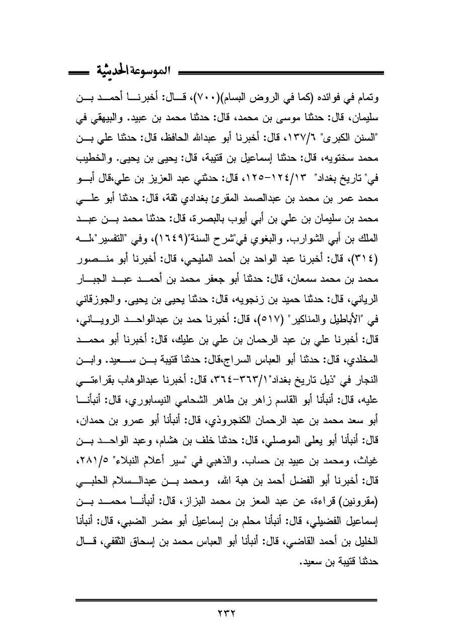 وتمام في فوائده (كما في الروض البسام) (٧٠٠)، قال: أخبرنا أحمد بن سليمان، قال: حَدَّثَنَا موسى بن محمد، قال: حَدَّثَنَا محمد بن عبيد. والبيهقي في "السنن الكبرى" ٦/ ١٣٧، قال: أخبرنا أبو عبد اللّه الحافظ، قال: حَدَّثَنَا علي بن محمد سختويه، قال: حَدَّثَنَا إسماعيل بن قتيبة، قال: يحيى بن يحيى. والخطيب في "تاريخ بغداد" ١٣/ ١٢٤ - ١٢٥، قال: حدثني عبد العزيز بن علي، قال أبو محمد عمر بن محمد بن عبد الصمد المقرئ بغدادي تقة، قال: حَدَّثَنَا أبو علي محمد بن سليمان بن علي بن أبي أيوب بالبصرة، قال: حَدَّثَنَا محمد بن عبد الملك بن أبي الشوارب. والبغوي في "شرح السنة" (١٦٤٩)، وفي "التفسير"، له (٣١٤)، قال: أخبرنا عبد الواحد بن أحمد المليحي، قال: أخبرنا أبو منصور محمد بن محمد سمعان، قال: حَدَّثَنَا أبو جعفر محمد بن أحمد عبد الجبار الرياني، قال: حَدَّثَنَا حميد بن زنجويه، قال: حَدَّثَنَا يحيى بن يحيى. والجوزقاني في "الأباطيل والمناكير" (٥١٧)، قال: أخبرنا حمد بن عبد الواحد الروياني، قال: أخبرنا علي بن عبد الرحمان بن علي بن عليك، قال: أخبرنا أبو محمد المخلدي، قال: حَدَّثَنَا أبو العباس السراج، قال: حَدَّثَنَا قتيبة بن سعيد. وابن النجار في "ذيل تاريخ بغداد" ١/ ٣٦٣ - ٣٦٤، قال: أخبرنا عبد الوهاب بقراءتي عليه، قال: أنبأنا أبو القاسم زاهر بن طاهر الشحامي النيسابوري، قال: أنبأنا أبو سعد محمد بن عبد الرحمان الكنجروذي، قال: أنبأنا أبو عمرو بن حمدان، قال: أنبأنا أبو يعلى الموصلي، قال: حَدَّثَنَا خلف بن هشام، وعبد الواحد بن غياث، ومحمد بن عبيد بن حساب. والذهبي في "سير أعلام النبلاء" ٥/ ٢٨١، قال: أخبرنا أبو الفضل أحمد بن هبة اللّه، ومحمد بن عبد السلام الحلبي (مقرونين) قراءة، عن عبد المعز بن محمد البزاز، قال: أنبأنا محمد بن إسماعيل الفضيلي، قال: أنبأنا محلم بن إسماعيل أبو مضر الضبي، قال: أنبأنا الخليل بن أحمد القاضي، قال: أنبأنا أبو العباس محمد بن إسحاق الثقفي، قال حَدَّثَنَا قتيبة بن سعيد.