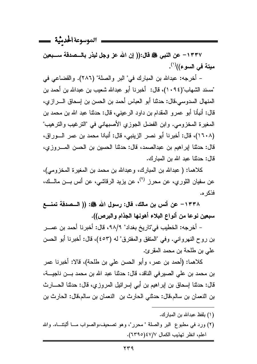 ١٣٣٨ - عن أنس بن مالك، قال: رسول اللّه - صلى الله عليه وسلم -: "الصدقة تمنع سبعين نوعا من أنواع البلاء أهونها الجذام والبرص".