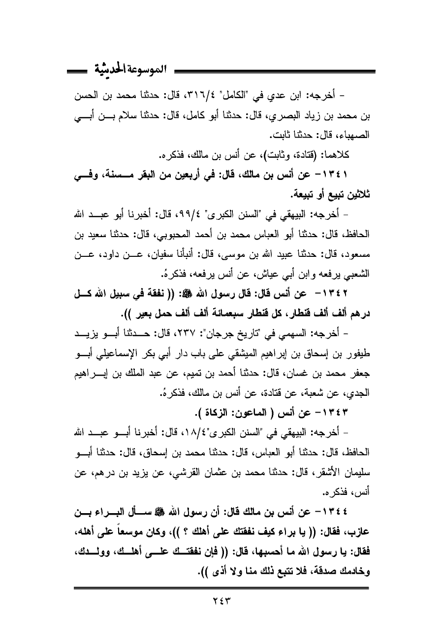 ١٣٤١ - عن أنس بن مالك، قال: في أربعين من البقر مسنة، وفي ثلاثين تبيع أو تبيعة.