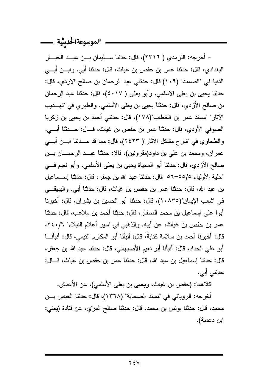 - أخرجه: الترمذي (٢٣١٦)، قال: حَدَّثَنَا سليمان بن عبد الحبار البغدادي، قال: حَدَّثَنَا عمر بن حفص بن غياث، قال: حَدَّثَنَا أبي. وابن أبي الدنيا في "الصمت" (١٠٩) قال: حدثني عبد الرحمان بن صالح الأزدي، قال: حَدَّثَنَا يحيى بن يعلى الأسلمي. وأبو يعلى (٤٠١٧)، قال: حَدَّثَنَا عبد الرحمان بن صالح الأزدي، قال: حَدَّثَنَا يحيى بن يعلى الأسلمي. والطبري في "تهذيب الآثار" "مسند عمر بن الخطاب" (١٧٨)، قال: حدثني أحمد بن يحيى بن زكريا الصوفي الأودي، قال: حَدَّثَنَا عمر بن حفص بن غياث، قال: حَدَّثَنَا أبي والطحاوي في "شرح مشكل الآثار" (٢٤٢٣)، قال: مما قد حَدَّثَنَا ابن أبي عمران، ومحمد بن علي بن داود (مقرونين)، قالا: حَدَّثَنَا عبد الرحمان بن صالح الأزدي، قال: حَدَّثَنَا أبو المحياة يحيى بن يعلى الأسلمي. وأبو نعيم في "حلية الأولياء" ٥/ ٥٥ - ٥٦ قال: حَدَّثَنَا عبد اللّه بن جعفر، قال: حَدَّثَنَا إسماعيل بن عبد اللّه، قال: حَدَّثَنَا عمر بن حفص بن غياث، قال: حَدَّثَنَا أبي. والبيهقي في "شعب الإيمان" (١٠٨٣٥)، قال: حَدَّثَنَا أبو الحسين بن بشران، قال: أخبرنا أبوا علي إسماعيل بن محمد الصفار، قال: حَدَّثَنَا أحمد بن ملاعب، قال: حَدَّثَنَا عمر بن حفص بن غياث، عن أبيه. والذهبي في "سير أعلام النبلاء" ٦/ ٢٤٠، قال: أخبرنا أحمد بن سلامة كتابةً، قال: أنبأنا أبو المكارم التيمي، قال: أنبأنا أبو علي الحداد، قال: أنبأنا أبو نعيم الأصبهاني، قال: حَدَّثَنَا عبد اللّه بن جعفر، قال: حَدَّثَنَا إسماعيل بن عبد اللّه، قال: حَدَّثَنَا عمر بن حفص بن غياث، قال: حدثني أبي.