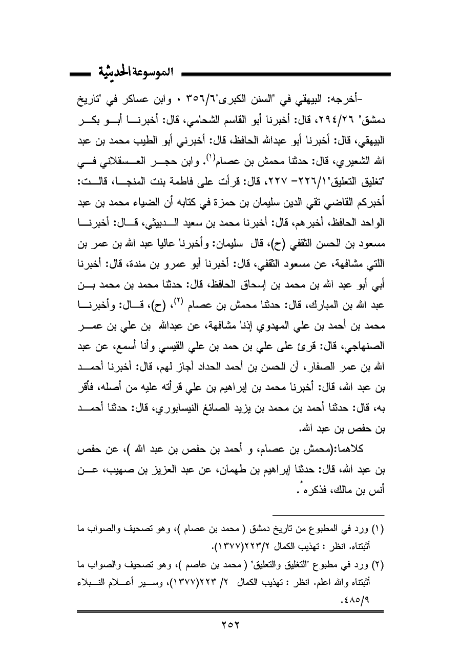 - أخرجه: البيهقي في "السنن الكبرى" ٦/ ٣٥٦. وابن عساكر في "تاريخ دمشق" ٢٦/ ٢٩٤، قال: أخبرنا أبو القاسم الشحامي، قال: أخبرنا أبو بكر البيهقي، قال: أخبرنا أبو عبد اللّه الحافظ، قال: أخبرني أبو الطيب محمد بن عبد اللّه الشعيري، قال: حدثنا محمش بن عصام (¬١). وابن حجر العسقلاني في "تغليق التعليق" ١/ ٢٢٦ - ٢٢٧، قال: قرأت على فاطمة بنت المنجا، قالت: أخبركم القاضي تقي الدين سليمان بن حمزة في كتابه أن الضياء محمد بن عبد الواحد الحافظ، أخبرهم، قال: أخبرنا محمد بن سعيد الدبيثي، قال: أخبرنا مسعود بن الحسن الثقفي (ح)، قال سليمان: وأخبرنا عاليا عبد اللّه بن عمر بن اللتي مشافهة، عن مسعود الثقفي، قال: أخبرنا أبو عمرو بن مندة، قال: أخبرنا أبي أبو عبد اللّه بن محمد بن إسحاق الحافظ، قال: حدثنا محمد بن محمد بن عبد اللّه بن المبارك، قال: حدثنا محمش بن عصام (¬٢)، (ح)، قال: وأخبرنا محمد بن أحمد بن علي المهدوي إذنا مشافهة، عن عبد اللّه بن علي بن عمر الصنهاجي، قال: قرئ على علي بن حمد بن علي القيسي وأنا أسمع، عن عبد اللّه بن عمر الصفار، أن الحسن بن أحمد الحداد أجاز لهم، قال: أخبرنا أحمد بن عبد اللّه، قال: أخبرنا محمد بن إبراهيم بن علي قرأته عليه من أصله، فأقر به، قال: حدثنا أحمد بن محمد بن يزيد الصائغ النيسابوري، قال: حدثنا أحمد بن حفص بن عبد اللّه.