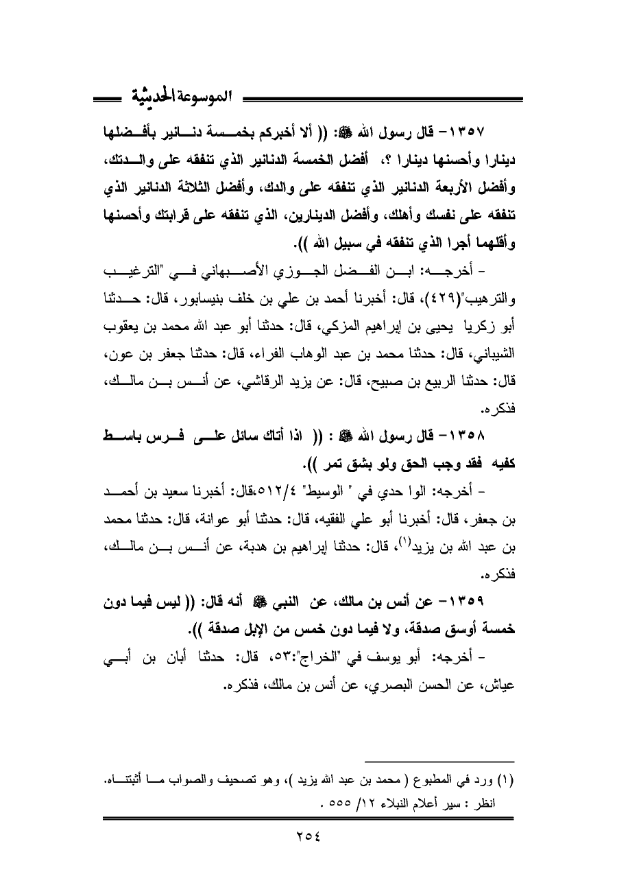 ١٣٥٧ - قال رسول اللّه - صلى الله عليه وسلم -: "ألا أخبركم بخمسة دنانير بأفضلها دينارا وأحسنها دينارا؟، أفضل الخمسة الدنانير الذي تنفقه على والدتك، وأفضل الأربعة الدنانير الذي تنفقه على والدك، وأفضل الثلاثة الدنانير الذي تنفقه على نفسك وأهلك، وأفضل الدينارين، الذي تنفقه على قرابتك وأحسنها وأقلهما أجرا الذي تنفقه في سبيل اللّه".
