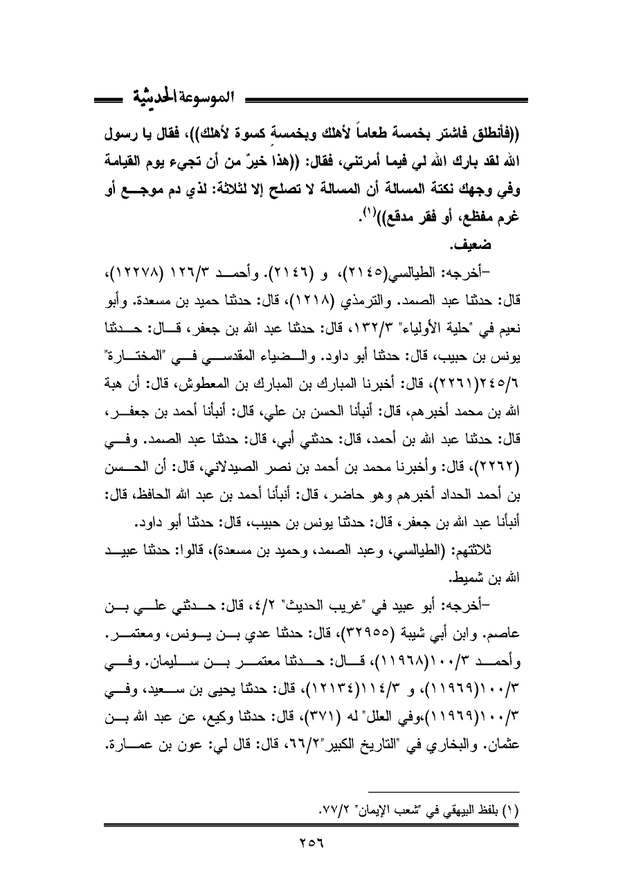 "فأنطلق فاشتر بخمسة طعامًا لأهلك وبخمسةٍ كسوة لأهلك"، فقال يا رسول اللّه لقد بارك اللّه لي فيما أمرتني، فقال: "هذا خيرٌ من أن تجيء يوم القيامة وفي وجهك نكتة المسألة أن المسألة لا تصلح إلا لثلاثة: لذي دم موجع أو غرم مفظع، أو فقر مدقع" (¬١).