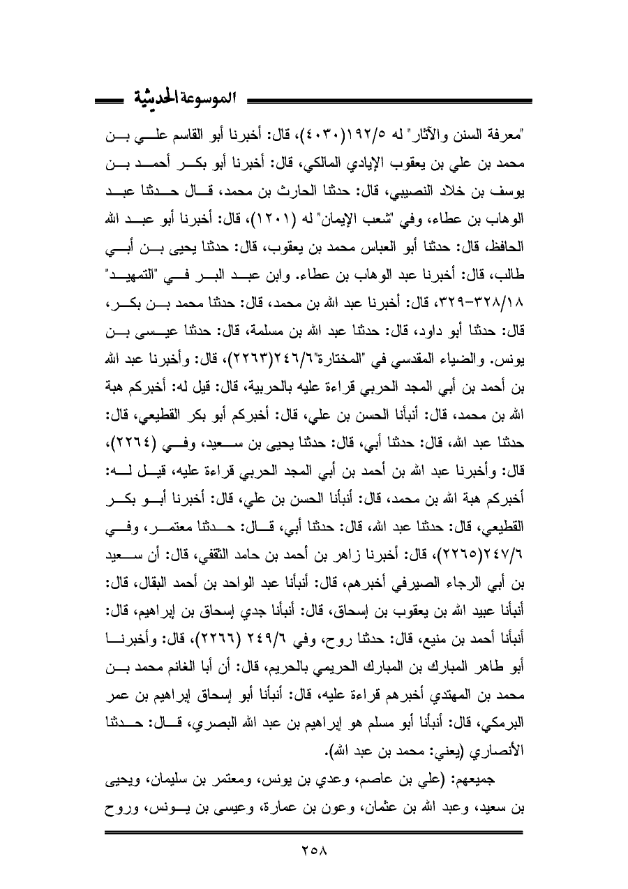 "معرفة السنن والآثار" له ٥/ ١٩٢ (٤٠٣٠)، قال: أخبرنا أبو القاسم علي بن محمد بن علي بن يعقوب الإيادي المالكي، قال: أخبرنا أبو بكر أحمد بن يوسف بن خلاد النصيبي، قال: حدثنا الحارث بن محمد، قال حدثنا عبد الوهاب بن عطاء، وفي "شعب الإيمان" له (١٢٠١)، قال: أخبرنا أبو عبد اللّه الحافظ، قال: حدثنا أبو العباس محمد بن يعقوب، قال: حدثنا يحيى بن أبي طالب، قال: أخبرنا عبد الوهاب بن عطاء. وابن عبد البر في "التمهيد" ١٨/ ٣٢٨ - ٣٢٩، قال: أخبرنا عبد اللّه بن محمد، قال: حدثنا محمد بن بكر، قال: حدثنا أبو داود، قال: حدثنا عبد اللّه بن مسلمة، قال: حدثنا عيسى بن يونس. والضياء المقدسي في "المختارة" ٦/ ٢٤٦ (٢٢٦٣)، قال: وأخبرنا عبد اللّه بن أحمد بن أبي المجد الحربي قراءة عليه بالحربية، قال: قيل له: أخبركم هبة اللّه بن محمد، قال: أنبأنا الحسن بن علي، قال: أخبركم أبو بكر القطيعي، قال: حدثنا عبد اللّه، قال: حدثنا أبي، قال: حدثنا يحيى بن سعيد، وفي (٢٢٦٤)، قال: وأخبرنا عبد اللّه بن أحمد بن أبي المجد الحربي قراءة عليه، قيل له: أخبركم هبة اللّه بن محمد، قال: أنبأنا الحسن بن علي، قال: أخبرنا أبو بكر القطيعي، قال: حدثنا عبد اللّه، قال: حدثنا أبي، قال: حدثنا معتمر، وفي ٦/ ٢٤٧ (٢٢٦٥)، قال: أخبرنا زاهر بن أحمد بن حامد الثقفي، قال: أن سعيد بن أبي الرجاء الصيرفي أخبرهم، قال: أنبأنا عبد الواحد بن أحمد البقال، قال: أنبأنا عبيد اللّه بن يعقوب بن إسحاق، قال: أنبأنا جدي إسحاق بن إبراهيم، قال: أنبأنا أحمد بن منيع، قال: حدثنا روح، وفي ٦/ ٢٤٩ (٢٢٦٦)، قال: وأخبرنا أبو طاهر المبارك بن المبارك الحريمي بالحريم، قال: أن أبا الغانم محمد بن محمد بن المهتدي أخبرهم قراءة عليه، قال: أنبأنا أبو إسحاق إبراهيم بن عمر البرمكي، قال: أنبأنا أبو مسلم هو إبراهيم بن عبد اللّه البصري، قال: حدثنا الأنصاري (يعني: محمد بن عبد اللّه).