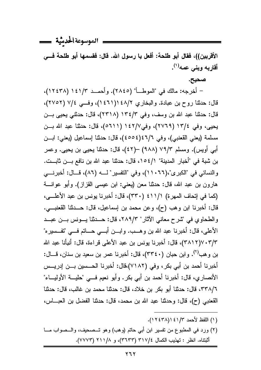 - أخرجه: مالك في "الموطأ" (٢٨٤٥). وأحمد ٣/ ١٤١ (١٢٤٣٨)، قال: حدثنا روح بن عبادة. والبخاري ٢/ ١٤٨ (١٤٦١)، وفي ٤/ ٧ (٢٧٥٢)، قال: حدثنا عبد اللّه بن يوسف، وفي ٣/ ١٣٤ (٢٣١٨)، قال: حدثني يحيى بن يحيى، وفي ٤/ ١٣ (٢٧٦٩)، وفي ٧/ ١٤٢ (٥٦١١)، قال: حدثنا عبد اللّه بن مسلمة (يعني القعنبي)، وفي ٦/ ٤٦ (٤٥٥٤)، قال: حدثنا إسماعيل (يعني: ابن أبي أويس). ومسلم ٣/ ٧٩ (٩٨٨) - (٤٢)، قال: حدثنا يحيى بن يحيى. وعمر بن شبة في "أخبار المدينة" ١/ ١٥٤، قال: حدثنا عبد اللّه بن نافع بن ثابت. والنسائي في "الكبرى"، (١١٠٦٦)، وفي "التفسير" له (٨٦)، قال: أخبرني هارون بن عبد اللّه، قال: حدثنا معن (يعني: ابن عيسى القزاز). وأبو عوانة (كما في إتحاف المهرة) ١/ ٤١١ (٣٣٠)، قال: أخبرنا يونس بن عبد الأعلى، قال: أخبرنا ابن وهب (ح)، وعن محمد بن إسماعيل، قال: حدثنا القعنبي. والطحاوي في شرح معاني الآثار" ٣/ ٢٨٩، قال: حدثنا يونس بن عبد الأعلى، قال: أخبرنا عبد اللّه بن وهب. وابن أبي حاتم في "تفسيره" ٣/ ٧٠٣ (٣٨١٢)، قال: أخبرنا يونس بن عبد الأعلى قراءة، قال: أنبأنا عبد اللّه بن وهب (¬٢). وابن حبان (٣٣٤٠)، قال: أخبرنا عمر بن سعيد بن سنان، قال: أخبرنا أحمد بن أبي بكر، وفي (٧١٨٢)، قال: أخبرنا الحسين بن إدريس الأنصاري، قال: أخبرنا أحمد بن أبي بكر. وأبو نعيم في "حلية الأولياء" ٦/ ٣٣٨، قال: حدثنا أبو بكر بن خلاد، قال: حدثنا محمد بن غالب، قال: حدثنا القعنبي (ح)، قال: وحدثنا عبد اللّه بن محمد، قال: حدثنا الفضل بن العباس،