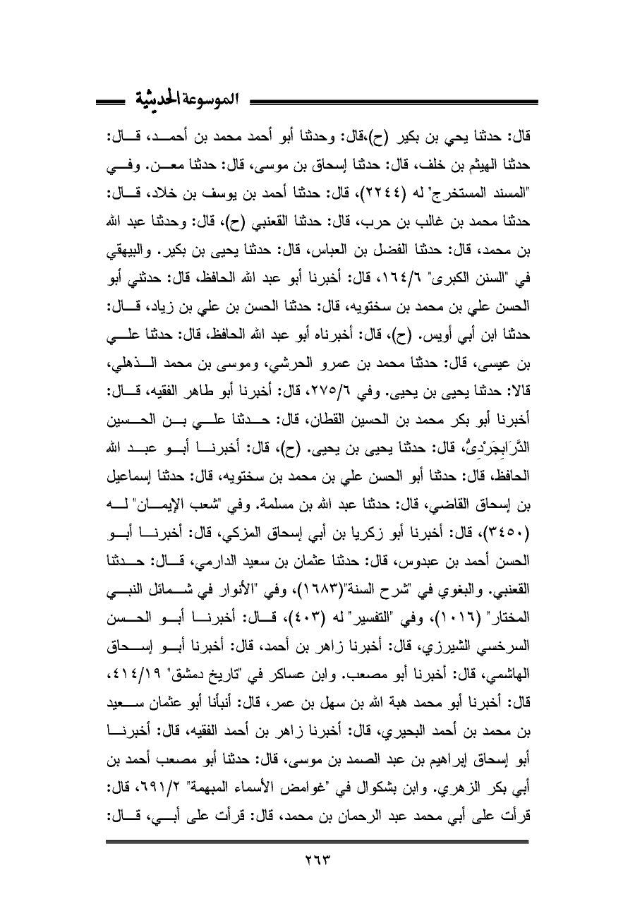 قال: حدثنا يحيى بن بكير (ح)، قال: وحدثنا أبو أحمد محمد بن أحمد، قال: حدثنا الهيثم بن خلف، قال: حدثنا إسحاق بن موسى، قال: حدثنا معن. وفي "المسند المستخرج" له (٢٢٤٤)، قال: حدثنا أحمد بن يوسف بن خلاد، قال: حدثنا محمد بن غالب بن حرب، قال: حدثنا القعنبي (ح)، قال: وحدثنا عبد اللّه بن محمد، قال: حدثنا الفضل بن العباس، قال: حدثنا يحيى بن بكير. والبيهقي في "السنن الكبرى" ٦/ ١٦٤، قال: أخبرنا أبو عبد اللّه الحافظ، قال: حدثني أبو الحسن علي بن محمد بن سختويه، قال: حدثنا الحسن بن علي بن زياد، قال: حدثنا ابن أبي أويس. (ح)، قال: أخبرناه أبو عبد اللّه الحافظ، قال: حدثنا علي بن عيسى، قال: حدثنا محمد بن عمرو الحرشي، وموسى بن محمد الذهلي، قالا: حدثنا يحيى بن يحيى. وفي ٦/ ٢٧٥، قال: أخبرنا أبو طاهر الفقيه، قال: أخبرنا أبو بكر محمد بن الحسين القطان، قال: حدثنا علي بن الحسين الدَّرَابِجَرْدِىُّ، قال: حدثنا يحيى بن يحيى. (ح)، قال: أخبرنا أبو عبد اللّه الحافظ، قال: حدثنا أبو الحسن علي بن محمد بن سختويه، قال: حدثنا إسماعيل بن إسحاق القاضي، قال: حدثنا عبد اللّه بن مسلمة. وفي "شعب الإيمان" له (٣٤٥٠)، قال: أخبرنا أبو زكريا بن أبي إسحاق المزكي، قال: أخبرنا أبو الحسن أحمد بن عبدوس، قال: حدثنا عثمان بن سعيد الدارمي، قال: حدثنا القعنبي. والبغوي في "شرح السنة" (١٦٨٣)، وفي "الأنوار في شمائل النبي المختار" (١٠١٦)، وفي "التفسير" له (٤٠٣)، قال: أخبرنا أبو الحسن السرخسي الشيرزي، قال: أخبرنا زاهر بن أحمد، قال: أخبرنا أبو إسحاق الهاشمي، قال: أخبرنا أبو مصعب. وابن عساكر في "تاريخ دمشق" ١٩/ ٤١٤، قال: أخبرنا أبو محمد هبة اللّه بن سهل بن عمر، قال: أنبأنا أبو عثمان سعيد بن محمد بن أحمد البحيري، قال: أخبرنا زاهر بن أحمد الفقيه، قال: أخبرنا أبو إسحاق إبراهيم بن عبد الصمد بن موسى، قال: حدثنا أبو مصعب أحمد بن أبي بكر الزهري. وابن بشكوال في "غوامض الأسماء المبهمة" ٢/ ٦٩١، قال: قرأت على أبي محمد عبد الرحمان بن محمد، قال: قرأت على أبي، قال: