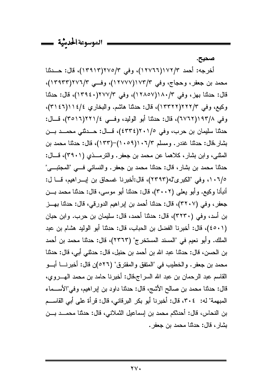 أخرجه: أحمد ٣/ ١٧٢ (١٢٧٦٦)، وفي ٣/ ٢٧٥ (١٣٩١٣)، قال: حدثنا محمد بن جعفر، وحجاج، وفي ٣/ ١٧٣ (١٢٧٧٧)، وفي ٣/ ٢٧٦ (١٣٩٣٣)، قال: حدثنا بهز، وفي ٣/ ١٨٠ (١٢٨٥٧)، وفي ٣/ ٢٧٧ (١٣٩٤٠)، قال: حدثنا وكيع، وفي ٣/ ٢٢٢ (١٣٣٢٢)، قال: حدثنا هاشم. والبخاري ٤/ ١١٤ (٣١٤٦)، وفي ٨/ ١٩٣ (٦٧٦٢)، قال: حدثنا أبو الوليد، وفي ٤/ ٢٢١ (٣٥١٦)، قال: حدثنا سليمان بن حرب، وفي ٥/ ٢٠١ (٤٣٣٤)، قال: حدثني محمد بن بشار، قال: حدثنا غندر. ومسلم ٦/ ١٠٣ (١٠٥٩) - (١٣٣)، قال: حدثنا محمد بن المثنى، وابن بشار، كلاهما عن محمد بن جعفر. والترمذي (٣٩٠١)، قال: حدثنا محمد بن بشار، قال: حدثنا محمد بن جعفر. والنسائي في "المجتبى" ٥/ ١٠٦، وفي "الكبرى" له (٢٣٩٣)، قال: أخبرنا إسحاق بن إبراهيم، قال: أنبأنا وكيع. وأبو يعلى (٣٠٠٢)، قال: حدثنا أبو موسى، قال: حدثنا محمد بن جعفر، وفي (٣٢٠٧)، قال: حدثنا أحمد بن إبراهيم الدورقي، قال: حدثنا بهز بن أسد، وفي (٣٢٣٠)، قال: حدثنا أحمد، قال: سليمان بن حرب. وابن حبان (٤٥٠١)، قال: أخبرنا الفضل بن الحباب، قال: حدثنا أبو الوليد هشام بن عبد الملك. وأبو نعيم في "المسند المستخرج" (٢٣٦٣)، قال: حدثنا محمد بن أحمد بن الحسن، قال: حدثنا عبد اللّه بن أحمد بن حنبل، قال: حدثني أبي، قال: حدثنا محمد بن جعفر. والخطيب في "المتفق والمفترق" (٥٢٦) ن قال: أخبرنا أبو القاسم عبد الرحمان بن عبد اللّه السراج، قال: أخبرنا حامد بن محمد الهروي، قال: حدثنا محمد بن صالح الأشج، قال: حدثنا داود بن إبراهيم، وفي "الأسماء المبهمة" له: ٣٠٤، قال: أخبرنا أبو بكر البرقاني، قال: قرأة على أبي القاسم بن النحاس، قال: أحدثكم محمد بن إسماعيل الثملاني، قال: حدثنا محمد بن بشار، قال: حدثنا محمد بن جعفر.