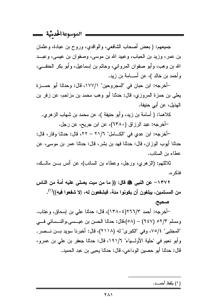 جميعهم: (بعض أصحاب الشافعي، والواقدي، وروح بن عبادة، وعثمان بن عمر، وزيد بن الحباب، وعبيد اللّه بن موسى، وصفوان بن عيسى، وعبد اللّه بن وهب، وأبو صفوان المرواني، وحاتم بن إسماعيل، وأبو بكر الحنفي، وأحمد بن خالد)، عن أسامة بن زيد.