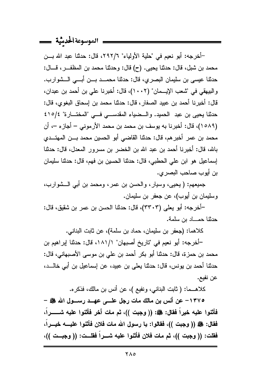 ١٣٧٥ - عن أنس بن مالك مات رجل على عهد رسول اللّه - صلى الله عليه وسلم - - فأثنوا عليه خيرًا فقال: - صلى الله عليه وسلم -: "وجبت"، ثم مات أخر فأثنوا عليه شرًا، فقال: - صلى الله عليه وسلم - "وجبت"، فقالوا: يا رسول اللّه مات فلان فأثنوا عليه خيرًا، فقلت: "وجبت"، ثم مات فلان فأثنوا عليه شرًا فقلت: "وجبت"،