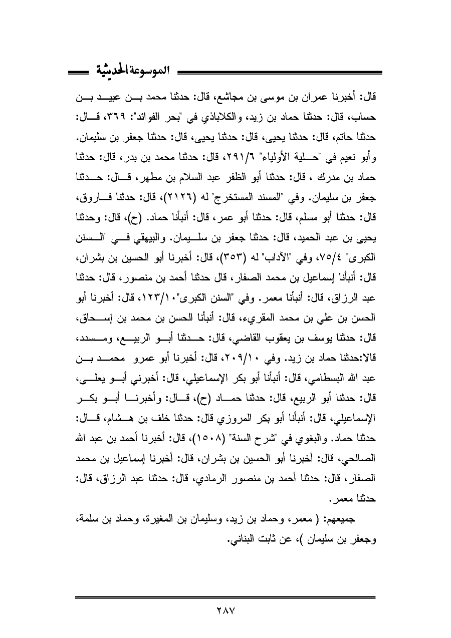 قال: أخبرنا عمران بن موسى بن مجاشع، قال: حدثنا محمد بن عبيد بن حساب، قال: حدثنا حماد بن زيد، والكلاباذي في "بحر الفوائد": ٣٦٩، قال: حدثنا حاتم، قال: حدثنا يحيى، قال: حدثنا يحيى، قال: حدثنا جعفر بن سليمان. وأبو نعيم في "حلية الأولياء" ٦/ ٢٩١، قال: حدثنا محمد بن بدر، قال: حدثنا حماد بن مدرك، قال: حدثنا أبو الظفر عبد السلام بن مطهر، قال: حدثنا جعفر بن سليمان. وفي "المسند المستخرج" له (٢١٢٦)، قال: حدثنا فاروق، قال: حدثنا أبو مسلم، قال: حدثنا أبو عمر، قال: أنبأنا حماد. (ح)، قال: وحدثنا يحيى بن عبد الحميد، قال: حدثنا جعفر بن سليمان. والبيهقي في "السنن الكبرى" ٤/ ٧٥، وفي "الآداب" له (٣٥٣)، قال: أخبرنا أبو الحسين بن بشران، قال: أنبأنا إسماعيل بن محمد الصفار، قال حدثنا أحمد بن منصور، قال: حدثنا عبد الرزاق، قال: أنبأنا معمر. وفي "السنن الكبرى" ١٠/ ١٢٣، قال: أخبرنا أبو الحسن بن علي بن محمد المقرئ، قال: أنبأنا الحسن بن محمد بن إسحاق، قال: حدثنا يوسف بن يعقوب القاضي، قال: حدثنا أبو الربيع، ومسدد، قالا: حدثنا حماد بن زيد. وفي ١٠/ ٢٠٩، قال: أخبرنا أبو عمرو محمد بن عبد اللّه البسطامي، قال: أنبأنا أبو بكر الإسماعيلي، قال: أخبرني أبو يعلى، قال: حدثنا أبو الربيع، قال: حدثنا حماد (ح)، قال: وأخبرنا أبو بكر الإسماعيلي، قال: أنبأنا أبو بكر المروزي قال: حدثنا خلف بن هشام، قال: حدثنا حماد. والبغوي في "شرح السنة" (١٥٠٨)، قال: أخبرنا أحمد بن عبد اللّه الصالحي، قال: أخبرنا أبو الحسين بن بشران، قال: أخبرنا إسماعيل بن محمد الصفار، قال: حدثنا أحمد بن منصور الرمادي، قال: حدثنا عبد الرزاق، قال: حدثنا معمر.