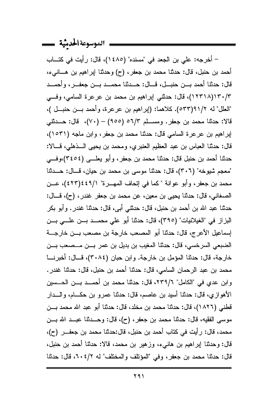 - أخرجه: علي بن الجعد في "مسنده" (١٤٨٥)، قال: رأيت في كتاب أحمد بن حنبل، قال: حدثنا محمد بن جعفر، (ح) وحدثنا إبراهيم بن هانئ، قال: حدثنا أحمد بن حنبل، قال: حدثنا محمد بن جعفر، وأحمد ٣/ ١٣٠ (١٢٣١٨)، قال: حدثني إبراهيم بن محمد بن عرعرة السامي، وفي "العلل" له ٢/ ٩١ (٥٣٣). كلاهما: (إبراهيم بن عرعرة، وأحمد بن حنبل)، قالا: حدثنا محمد بن جعفر. ومسلم ٣/ ٥٦ (٩٥٥) - (٧٠)، قال: حدثني إبراهيم بن عرعرة السامي قال: حدثنا محمد بن جعفر، وابن ماجه (١٥٣١)، قال: حدثنا العباس بن عبد العظيم العنبري، ومحمد بن يحيى الذهلي، قالا: حدثنا أحمد بن حنبل قال: حدثنا محمد بن جعفر، وأبو يعلى (٣٤٥٤)، وفي "معجم شيوخه" (٣٠٦)، قال: حدثنا موسى بن محمد بن حيان، قال: حدثنا محمد بن جعفر، وأبو عوانة "كما في إتحاف المهرة" ١/ ٤٤٩ (٤٢٣)، عن الصغاني، قال: حدثنا يحيى بن معين، عن محمد بن جعفر غندر، (ح)، قال: حدثنا عبد اللّه بن أحمد بن حنبل، قال: حدثني أبى، قال: حدثنا غندر. وأبو بكر البزاز في "الغيلانيات" (٣٩٥)، قال: حدثنا أبو علي محمد بن علي بن إسماعيل الأعرج، قال: حدثنا أبو المصعب خارجة بن مصعب بن خارجة الضبعي السرخسي، قال: حدثنا المغيب بن بديل بن عمر بن مصعب بن خارجة، قال: حدثنا المؤمل بن خارجة. وابن حبان (٣٠٨٤)، قال: أخبرنا محمد بن عبد الرحمان السامي، قال: حدثنا أحمد بن حنبل، قال: حدثنا غندر. وابن عدي في "الكامل" ٦/ ٢٣٩، قال: حدثنا محمد بن أحمد بن الحسين الأهوازي، قال: حدثنا أسيد بن عاصم، قال: حدثنا عمرو بن حكام، والدار قطني (١٨٢٦)، قال: حدثنا محمد بن مخلد، قال: حدثنا أبو عبد اللّه محمد بن موسى الفقيه، قال: حدثنا محمد بن جعفر، (ح)، قال: وحدثنا عبد اللّه بن محمد، قال: رأيت في كتاب أحمد بن حنبل، قال: حدثنا محمد بن جعفر (ح)، قال: وحدثنا إبراهيم بن هانيء، وزهير بن محمد، قالا: حدثنا أحمد بن حنبل، قال: حدثنا محمد بن جعفر، وفي "المؤتلف والمختلف" له ٢/ ٦٠٤، قال: حدثنا