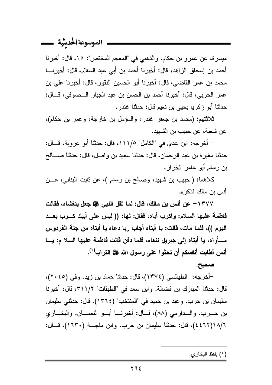 ١٣٧٧ - عن أنس بن مالك، قال: لما ثقل النبي - صلى الله عليه وسلم - جعل يتغشاه، فقالت فاطمة عليها السلام: واكرب أباه، فقال: لها: "ليس على أبيك كرب بعد اليوم"، فلما مات، قالت: يا أبتاه أجاب ربا دعاه يا أبتاه من جنة الفردوس مأواه، يا أبتاه إلى جبريل ننعاه، فلما دفن قالت فاطمة عليها السلام: يا أنس أطابت أنفسكم أن تحثوا على رسول اللّه - صلى الله عليه وسلم - التراب (¬١).