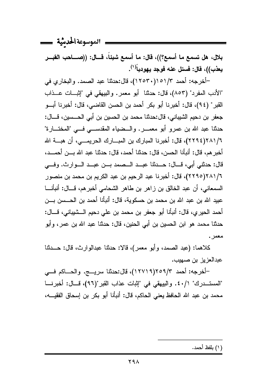 - أخرجه: أحمد ٣/ ١٥١ (١٢٥٣٠)، قال: حدثنا عبد الصمد. والبخاري في "الأدب المفرد" (٨٥٣)، قال: حدثنا أبو معمر. والبيهقي في "إثبات عذاب القبر" (٩٤)، قال: أخبرنا أبو بكر أحمد بن الحسن القاضي، قال: أخبرنا أبو جعفر بن دحيم الشيباني، قال: حدثنا محمد بن الحسين بن أبي الحسين، قال: حدثنا عبد اللّه بن عمرو أبو معمر. والضياء المقدسي في "المختارة" ٦/ ٢٨١ (٢٢٩٤)، قال: أخبرنا المبارك بن المبارك الحريمي، أن هبة اللّه أخبرهم، قال: أنبأنا الحسن، قال: حدثنا أحمد، قال: حدثنا عبد اللّه بن أحمد، قال: حدثني أبي، قال: حدثنا عبد الصمد بن عبد الوارث. وفي ٦/ ٢٨١ (٢٢٩٥)، قال: أخبرنا عبد الرحيم بن عبد الكريم بن محمد بن منصور السمعاني، أن عبد الخالق بن زاهر بن طاهر الشحامي أخبرهم، قال: أنبأنا عبيد اللّه بن عبد اللّه بن محمد بن حسكوية، قال: أنبأنا أحمد بن الحسن بن أحمد الحيري، قال: أنبأنا أبو جعفر بن محمد بن علي دحيم الشيباني، قال: حدثنا محمد هو ابن الحسين بن أبي الحنين، قال: حدثنا عبد اللّه بن عمر، وأبو معمر.