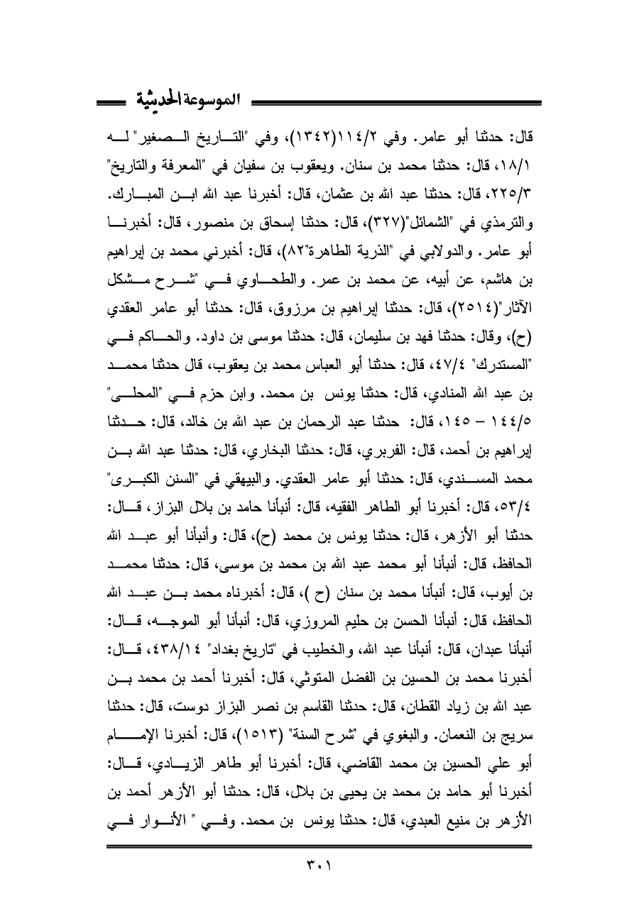 قال: حدثنا أبو عامر. وفي ٢/ ١١٤ (١٣٤٢)، وفي "التاريخ الصغير" له ١/ ١٨، قال: حدثنا محمد بن سنان. ويعقوب بن سفيان في "المعرفة والتاريخ" ٣/ ٢٢٥، قال: حدثنا عبد الله بن عثمان، قال: أخبرنا عبد الله بن المبارك. والترمذي في "الشمائل" (٣٢٧)، قال: حدثنا إسحاق بن منصور، قال: أخبرنا أبو عامر. والدولابي في "الذرية الطاهرة" (٨٢)، قال: أخبرني محمد بن إبراهيم بن هاشم، عن أبيه، عن محمد بن عمر. والطحاوي في "شرح مشكل الآثار" (٢٥١٤)، قال: حدثنا إبراهيم بن مرزوق، قال: حدثنا أبو عامر العقدي (ح)، وقال: حدثنا فهد بن سليمان، قال: حدثنا موسى بن داود. والحاكم في "المستدرك" ٤/ ٤٧، قال: حدثنا أبو العباس محمد بن يعقوب، قال حدثنا محمد بن عبد الله المنادي، قال: حدثنا يونس بن محمد. وابن حزم في "المحلى" ٥/ ١٤٤ - ١٤٥، قال: حدثنا عبد الرحمان بن عبد الله بن خالد، قال: حدثنا إبراهيم بن أحمد، قال: الفربري، قال: حدثنا البخاري، قال: حدثنا عبد الله بن محمد المسندي، قال: حدثنا أبو عامر العقدي. والبيهقي في "السنن الكبرى" ٤/ ٥٣، قال: أخبرنا أبو الطاهر الفقيه، قال: أنبأنا حامد بن بلال البزاز، قال: حدثنا أبو الأزهر، قال: حدثنا يونس بن محمد (ح)، قال: وأنبأنا أبو عبد الله الحافظ، قال: أنبأنا أبو محمد عبد الله بن محمد بن موسى، قال: حدثنا محمد بن أيوب، قال: أنبأنا محمد بن سنان (ح)، قال: أخبرناه محمد بن عبد الله الحافظ، قال: أنبأنا الحسن بن حليم المروزي، قال: أنبأنا أبو الموجه، قال: أنبأنا عبدان، قال: أنبأنا عبد الله، والخطيب في "تاريخ بغداد" ١٤/ ٤٣٨، قال: أخبرنا محمد بن الحسين بن الفضل المتوثي، قال: أخبرنا أحمد بن محمد بن عبد الله بن زياد القطان، قال: حدثنا القاسم بن نصر البزاز دوست، قال: حدثنا سريج بن النعمان. والبغوي في "شرح السنة" (١٥١٣)، قال: أخبرنا الإمام أبو علي الحسين بن محمد القاضي، قال: أخبرنا أبو طاهر الزيادي، قال: أخبرنا أبو حامد بن محمد بن يحيى بن بلال، قال: حدثنا أبو الأزهر أحمد بن الأزهر بن منيع العبدي، قال: حدثنا يونس بن محمد. وفي "الأنوار في