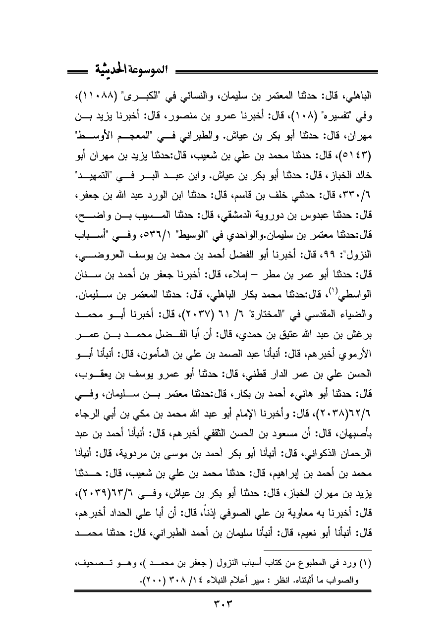 الباهلي، قال: حدثنا المعتمر بن سليمان، والنسائي في "الكبرى" (١١٠٨٨)، وفي تفسيره" (١٠٨)، قال: أخبرنا عمرو بن منصور، قال: أخبرنا يزيد بن مهران، قال: حدثنا أبو بكر بن عياش. والطبراني في "المعجم الأوسط" (٥١٤٣)، قال: حدثنا محمد بن علي بن شعيب، قال: حدثنا يزيد بن مهران أبو خالد الخباز، قال: حدثنا أبو بكر بن عياش. وابن عبد البر في "التمهيد" ٦/ ٣٣٠، قال: حدثني خلف بن قاسم، قال: حدثنا ابن الورد عبد الله بن جعفر، قال: حدثنا عبدوس بن دوروية الدمشقي، قال: حدثنا المسيب بن واضح، قال: حدثنا معتمر بن سليمان. والواحدي في "الوسيط" ١/ ٥٣٦، وفي "أسباب النزول": ٩٩، قال: أخبرنا أبو الفضل أحمد بن محمد بن يوسف العروضي، قال: حدثنا أبو عمر بن مطر - إملاء، قال: أخبرنا جعفر بن أحمد بن سنان الواسطي (¬١)، قال: حدثنا محمد بكار الباهلي، قال: حدثنا المعتمر بن سليمان. والضياء المقدسي في "المختارة" ٦/ ٦١ (٢٠٣٧)، قال: أخبرنا أبو محمد برغش بن عبد الله عتيق بن حمدي، قال: أن أبا الفضل محمد بن عمر الأرموي أخبرهم، قال: أنبأنا عبد الصمد بن علي بن المأمون، قال: أنبأنا أبو الحسن علي بن عمر الدارقطني، قال: حدثنا أبو عمرو يوسف بن يعقوب، قال: حدثنا أبو هانيء أحمد بن بكار، قال: حدثنا معتمر بن سليمان، وفي ٦/ ٦٢ (٢٠٣٨)، قال: وأخبرنا الإمام أبو عبد الله محمد بن مكي بن أبي الرجاء بأصبهان، قال: أن مسعود بن الحسن الثقفي أخبرهم، قال: أنبأنا أحمد بن عبد الرحمان الذكواني، قال: أنبأنا أبو بكر أحمد بن موسى بن مردوية، قال: أنبأنا محمد بن أحمد بن إبراهيم، قال: حدثنا محمد بن علي بن شعيب، قال: حدثنا يزيد بن مهران الخباز، قال: حدثنا أبو بكر بن عياش، وفي ٦/ ٦٣ (٢٠٣٩)، قال: أخبرنا به معاوية بن علي الصوفي إذنًا، قال: أن أبا علي الحداد أخبرهم، قال: أنبأنا أبو نعيم، قال: أنبأنا سليمان بن أحمد الطبراني، قال: حدثنا محمد